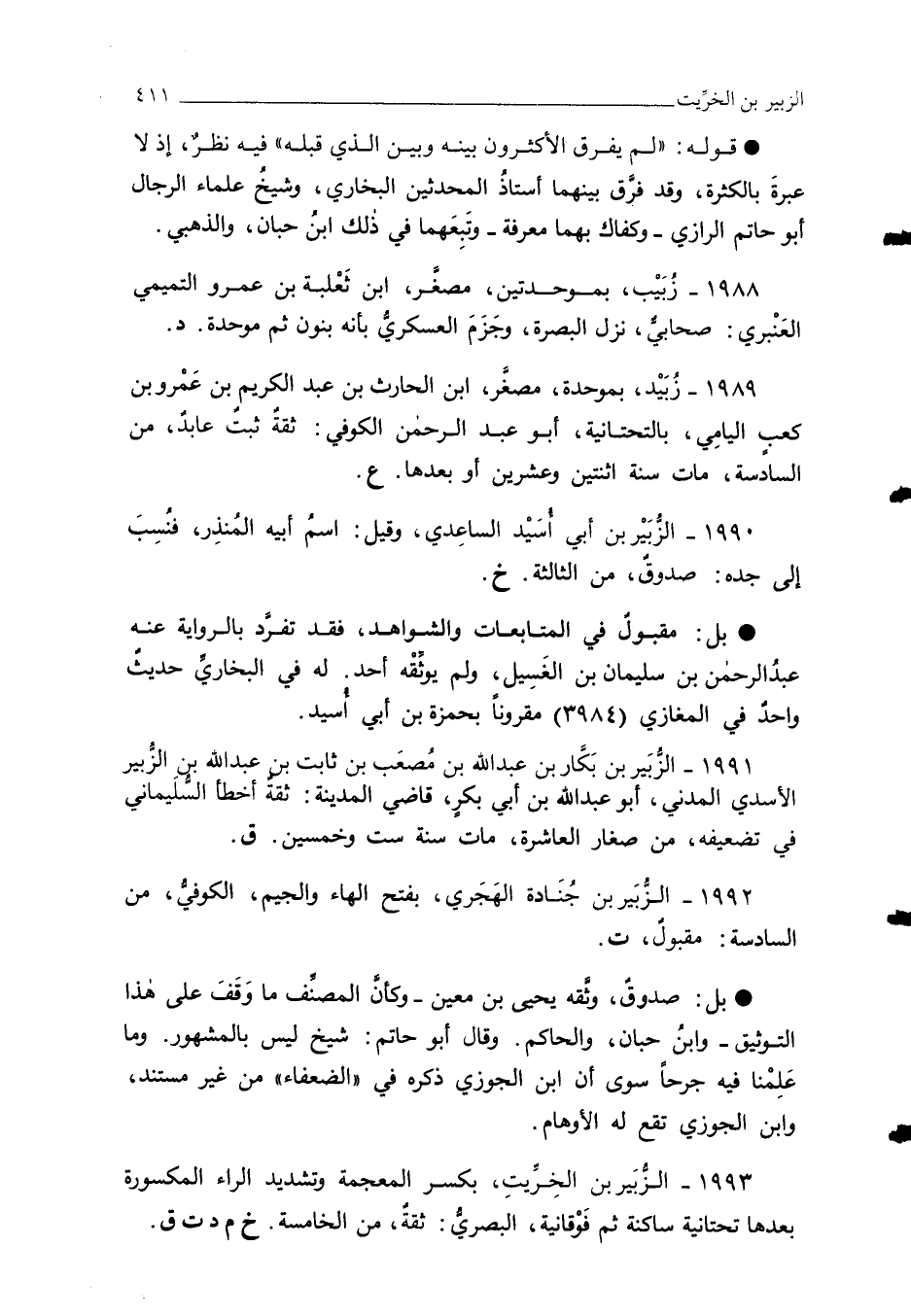 1990 - الزُّبَيْر بن أبي أُسَيْد الساعِدي، وقيل: اسمُ أبيه المنذِر، فنُسِبَ إلى جده: صدوقٌ، من الثالثة. خ.
