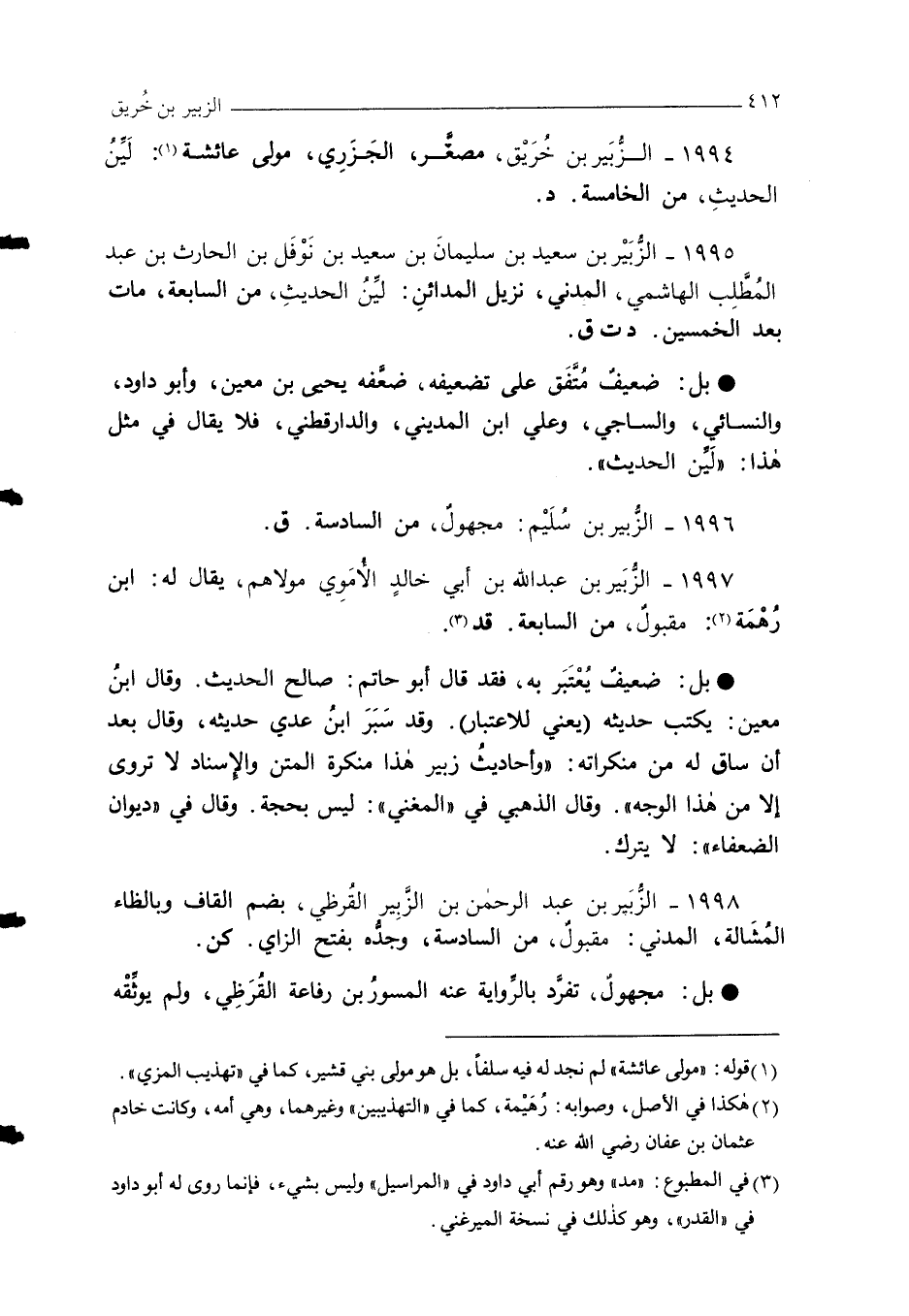 1998 - الزُّبَير بن عبد الرحمن بن الزَّبِير القْرظي، بضم القاف وبالظاء المُشَالة، المدني: مقبولٌ، من السادسة، وجدُّه بفتح الزاي. كن.