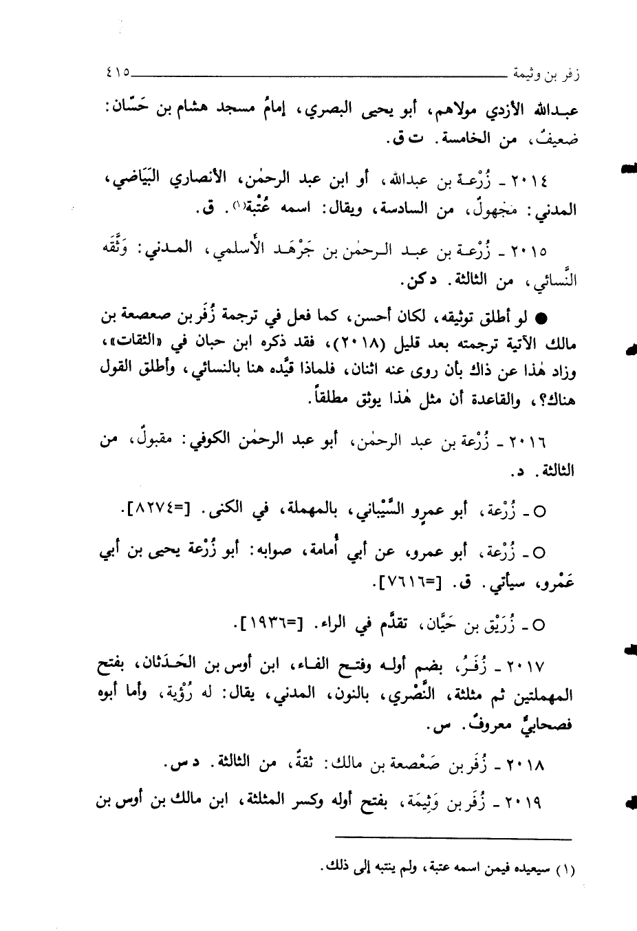 2016 - زُرْعة بن عبد الرحمن، أبو عبد الرحمن الكوفي: مقبولٌ، من الثالثة. د.