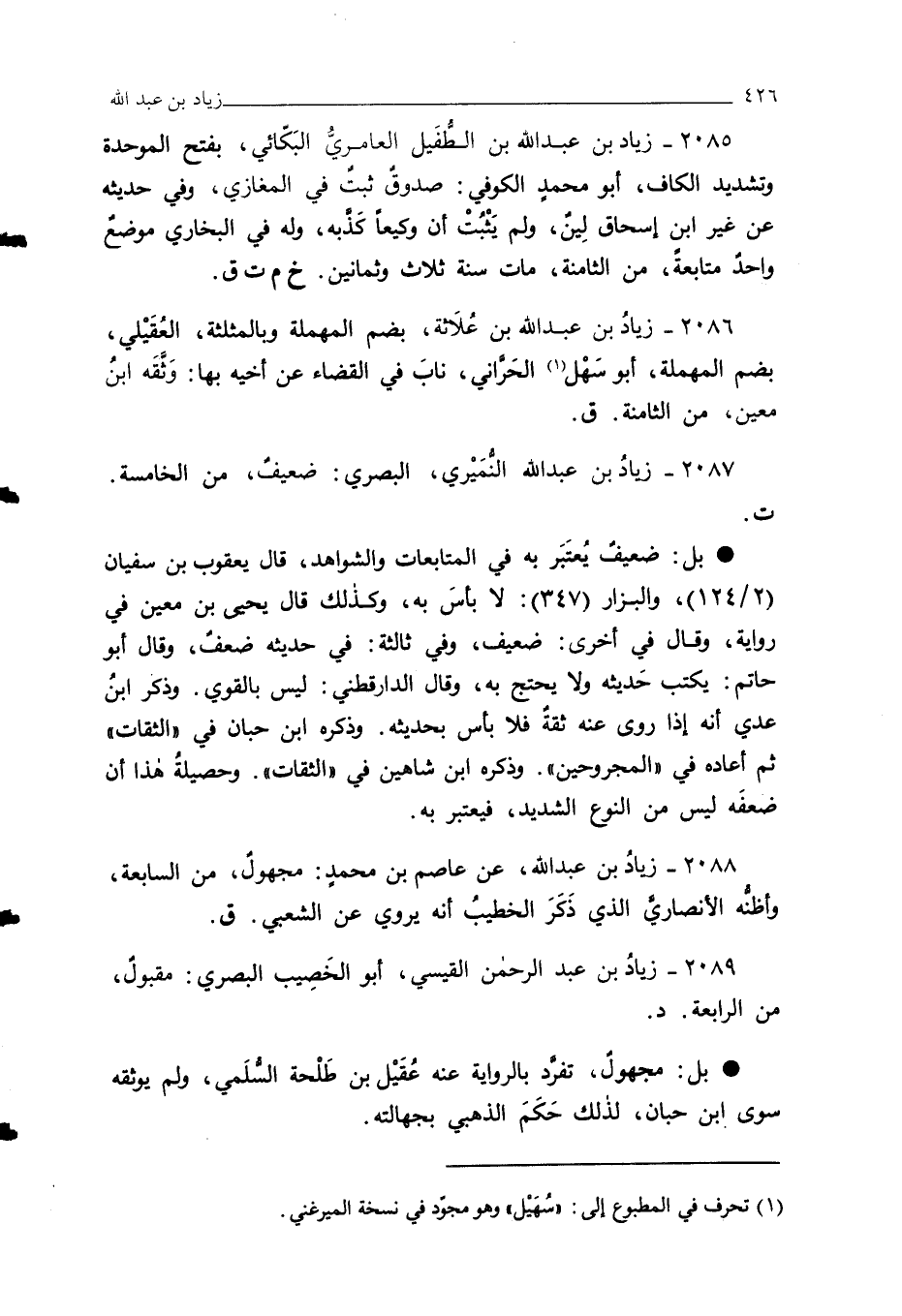 2085 - زياد بن عبد الله بن الطُّفَيل العامريُّ البَكَّائي، بفتح الموحدة وتشديد الكاف، أبو محمدٍ الكوفي: صدوقٌ ثبتٌ في المغازي، وفي حديثه عن غير ابن إسحاق لِينٌ، ولم يَثْبُت أن وكيعًا كَذَّبه، وله في البخاري موضعٌ واحدٌ متابعةٌ؛ من الثامنة، مات سنة ثلاث وثمانين. خ م ت ق.