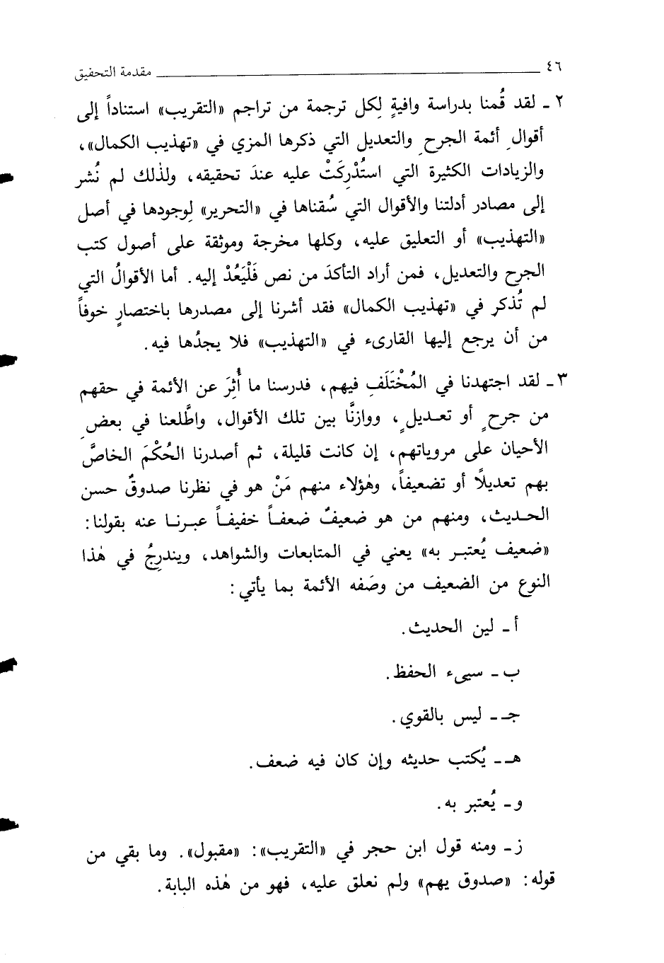 2 - لقد قُمنا بدراسة وافيةٍ لِكل ترجمة من تراجم "التقريب" استنادًا إلى أقوالِ أئمة الجرحِ والتعديل التي ذكرها المزي في "تهذيب الكمال"، والزيادات الكثيرة التي استُدْرِكَتْ عليه عندَ تحقيقه، ولذلك لم نُشِر إلى مصادر أدلتنا والأقوال التي سُقناها في "التحرير" لِوجودها في أصل "التهذيب" أو التعليق عليه، وكلها مخرجة وموثقة على أصول كتب الجرح والتعديل، فمن أراد التأكدَ من نص فلْيَعُدْ إليه. أما الأقوالُ التي لم تذكر في "تهذيب الكمال" فقد أشرنا إلى مصدرها باختصارٍ خوفًا من أن يرجع إليها القاريء في "التهذيب" فلا يجدُها فيه.