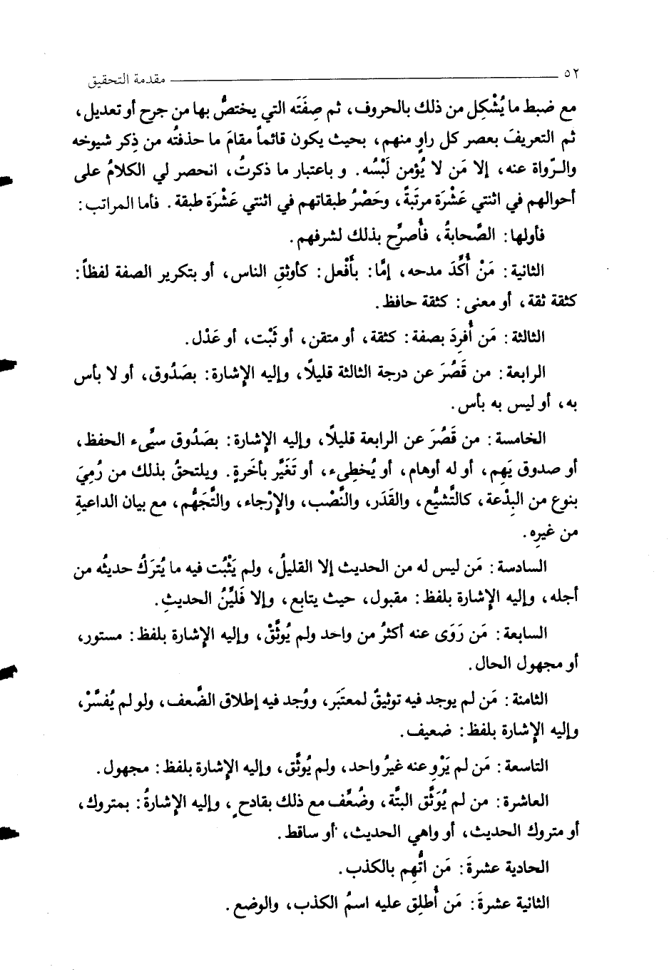 مع ضبط ما يُشكِل من ذلك بالحروف، ثم صِفَتَه التي يختص بها من جرح أو تعديل، ثم التعريف بعصر كل راوٍ منهم، بحيث يكون قائما مقامَ ما حذفتُه من ذِكر شيوخه والرواة عنه، إلا مَن لا يؤمن لَبْسُه. وباعتبار ما ذكرتُ، انحصر لي الكلامُ على أحوالهم في اثنتي عَشرَة مرتبة، وحَصْرُ طبقاتهم في اثنتي عَشرَة طبقة. فأما المراتب: