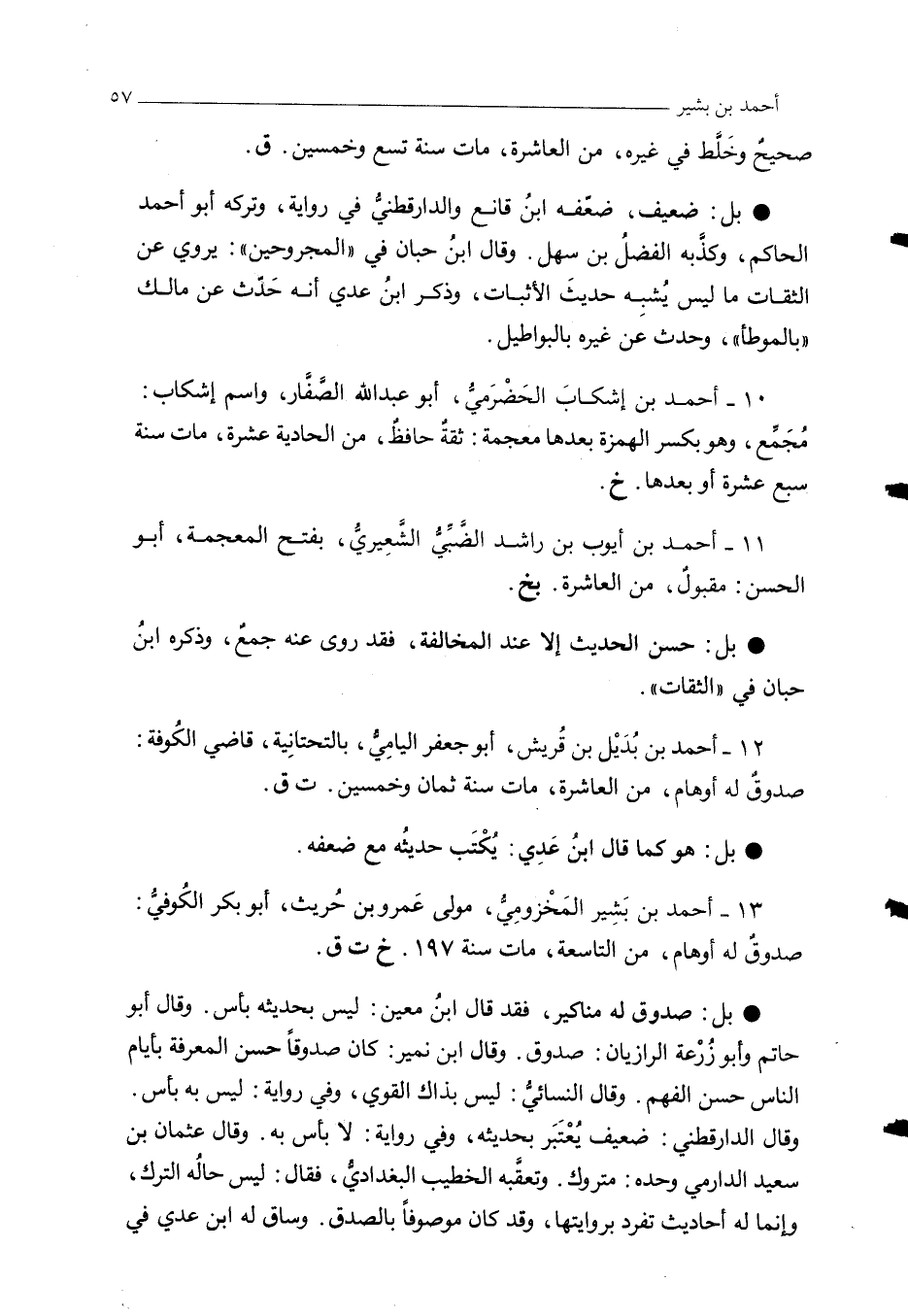 13 - أحمد بن بشير المَخْزومِيّ، مولى عَمرو بن حُريث، أبو بكر الكوفي: صدوقٌ له أوهام، من التاسعة، مات سنة 197. خ ت ق.