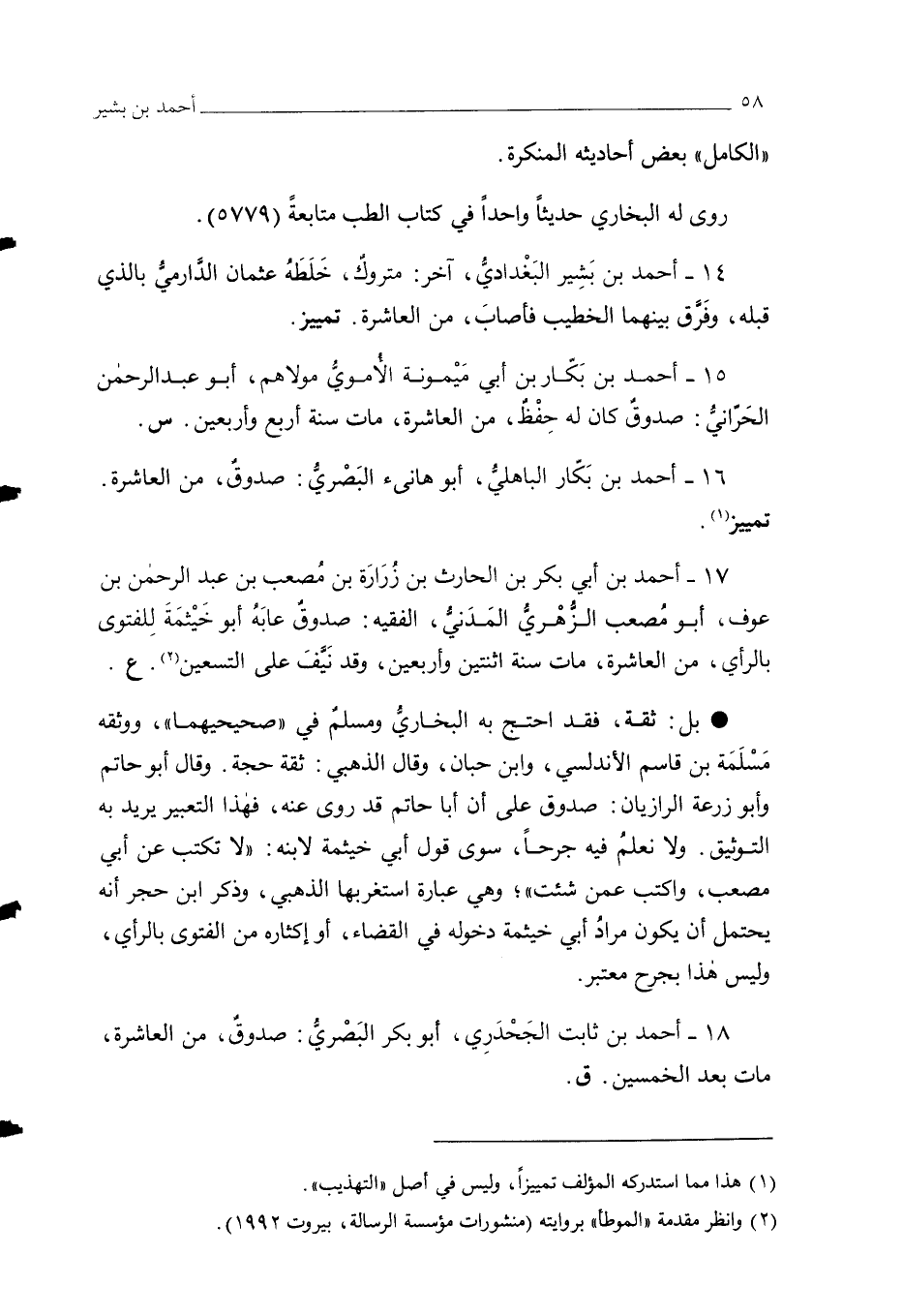 17 - أحمد بن أبي بكر بن الحارث بن زرارَة بن مُصعب بن عبد الرحمن بن عوف، أبو مصعب الزهْري المَدَني، الفقيه: صدوق عابَهُ أبو خْيثمةَ لِلفتوى بالرأي، من العاشرة، مات سنة اثنتين وأربعين، وقد نَيَّفَ على التسعين (¬2). ع.