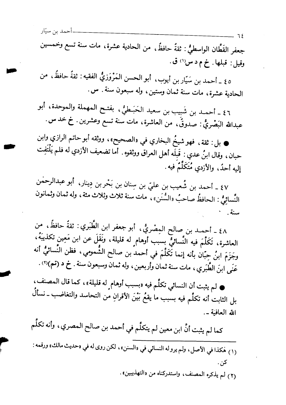 48 - أحمد بن صالح المِصْري، أبو جعفر بن الطبري: ثقة حافظ، من العاشرة، تَكَلَّمَ فيه النسائي بسبب أوهام له قليلة، ونَقل عن ابن مَعِين تكذيبَهُ، وجَزَم ابن حِبَّان بأنه إنما تَكلَّم في أحمد بن صالح الشمومي، فظن النسائي أنه عَنَى ابنَ الطبَري، مات سنة ثمان وأربعين، وله ثمان وسبعون سنة. خ د (تم) (¬2).