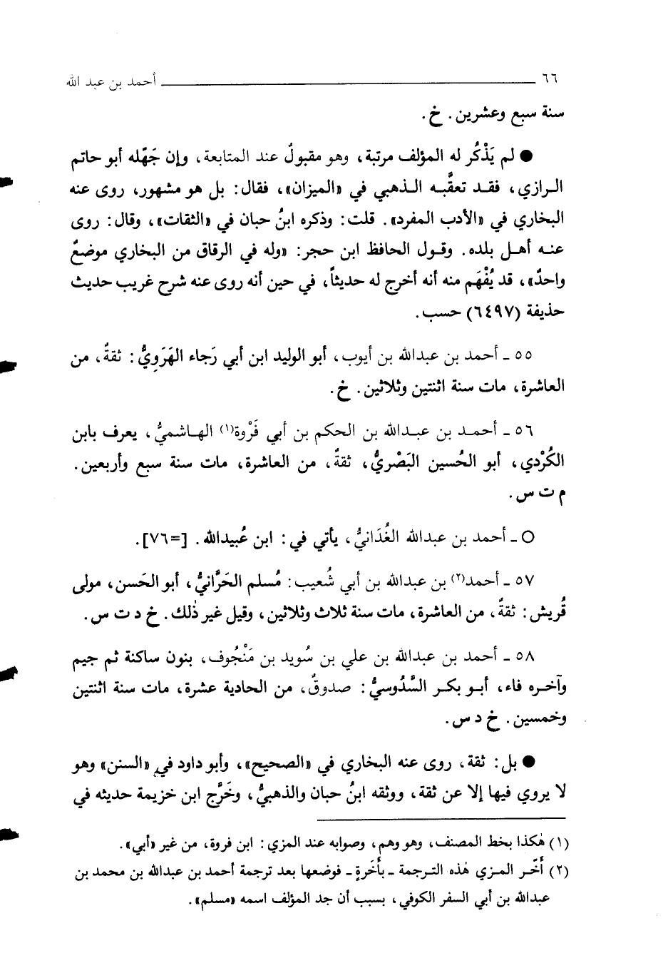 58 - أحمد بن عبد الله بن علي بن سُويد بن مَنْجُوف، بنون ساكنة ثم جيم وآخره فاء، أبو بكر السَّدُوسي: صدوقٌ، من الحادية عشرة، مات سنة اثنتين وخمسين. خ د س.