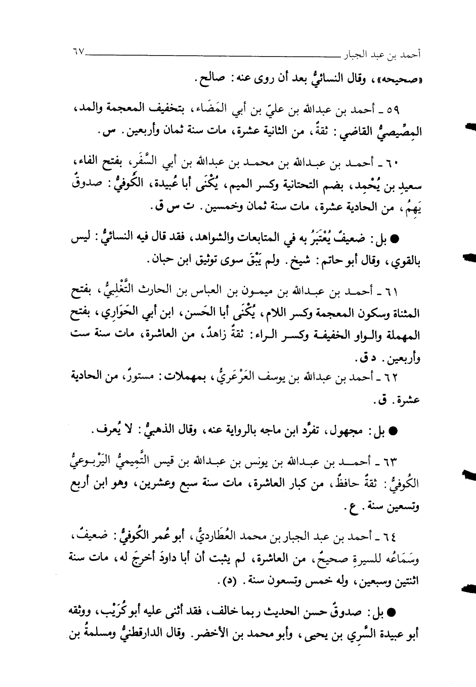 64 - أحمد بن عبد الجبار بن محمد العطَارديُّ، أبو عمر الكوفي: ضعيف، وسماعُه للسيرةِ صحيح، من العاشرة، لم يثبت أن أبا داودَ أخرجَ له، مات سنة اثنتين وسبعين، وله خمس وتسعون سنة. (د).
