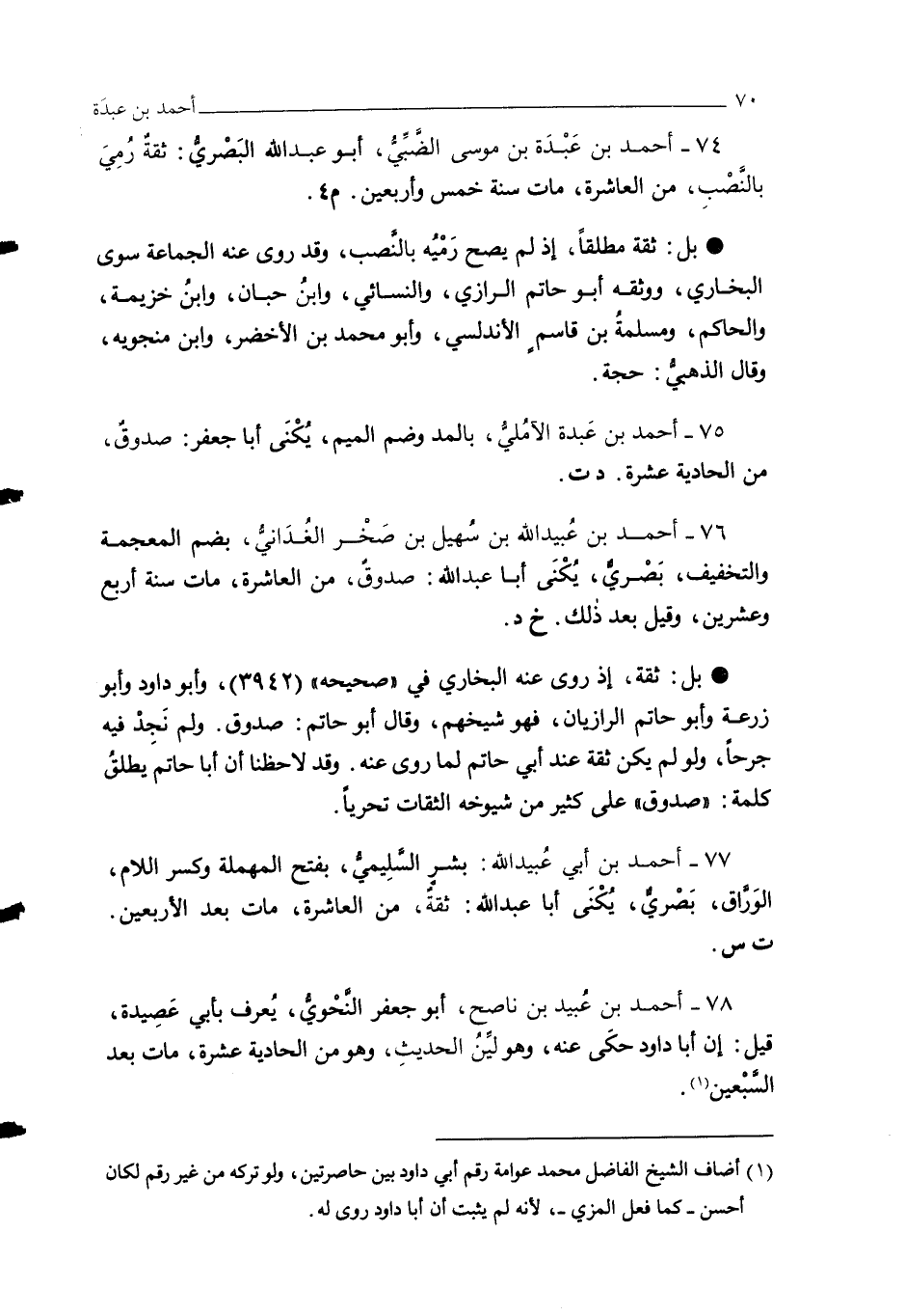 74 - أحمد بن عَبْدَة بن موسى الضبي، أبو عبد الله البَصْري: ثقة رُمِيَ بالنَّصْبِ، من العاشرة، مات سنة خمس وأربعين. م 4.