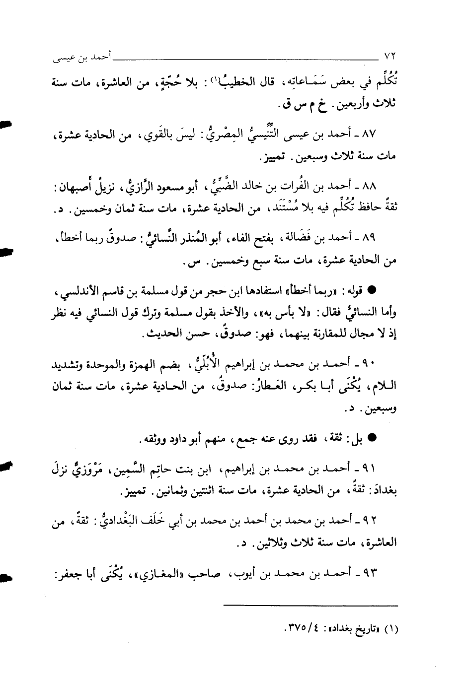 87 - أحمد بن عيسى التنيسيُّ المِصْريُّ: ليس بالقَوي، من الحادية عشرة، مات سنة ثلاث وسبعين. تمييز.