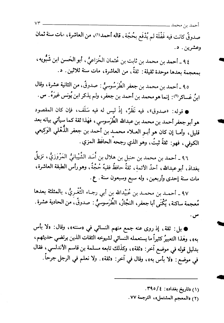 95 - أحمد بن محمد بن جعفر الطرسُوسيُّ: صدوق، من الثانية عشرة، وقال ابنُ عَساكر (¬2): إنما هو محمد بن أحمد بن جعفر، ولم يذكر ابن يُونس غيرَه. س.