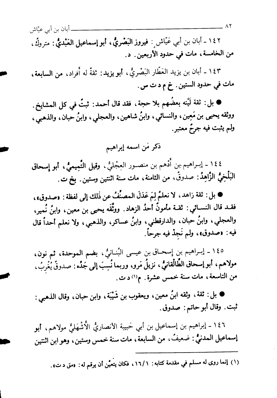 142 - أبان بن أبي عَيَّاشٍ: فيروز البَصْريُّ، أبو إسماعبل العَبْديُّ: متروكٌ، من الخامسة، مات في حدود الأربعين. د.