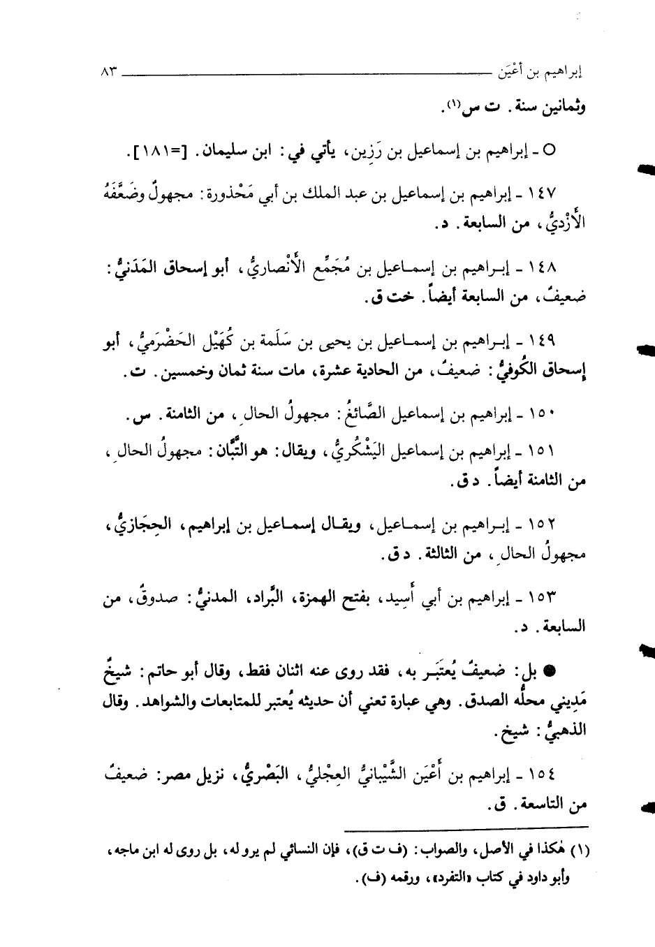 149 - إبراهيم بن إسماعيل بن يحيى بن سَلَمة بن كهَيْل الحَضْرميُّ، أبو إسحاق الكُوفيُّ: ضعِيفٌ، من الحادية عشرة، مات سنة ثمان وخمسين. ت.