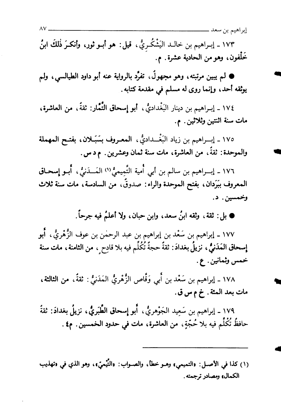 173 - إبراهيم بن خالد اليَشْكرِيُّ، قيل: هو أبو ثور، وأنكرَ ذلك ابنُ خَلْفون، وهو من الحادية عشرة. م.