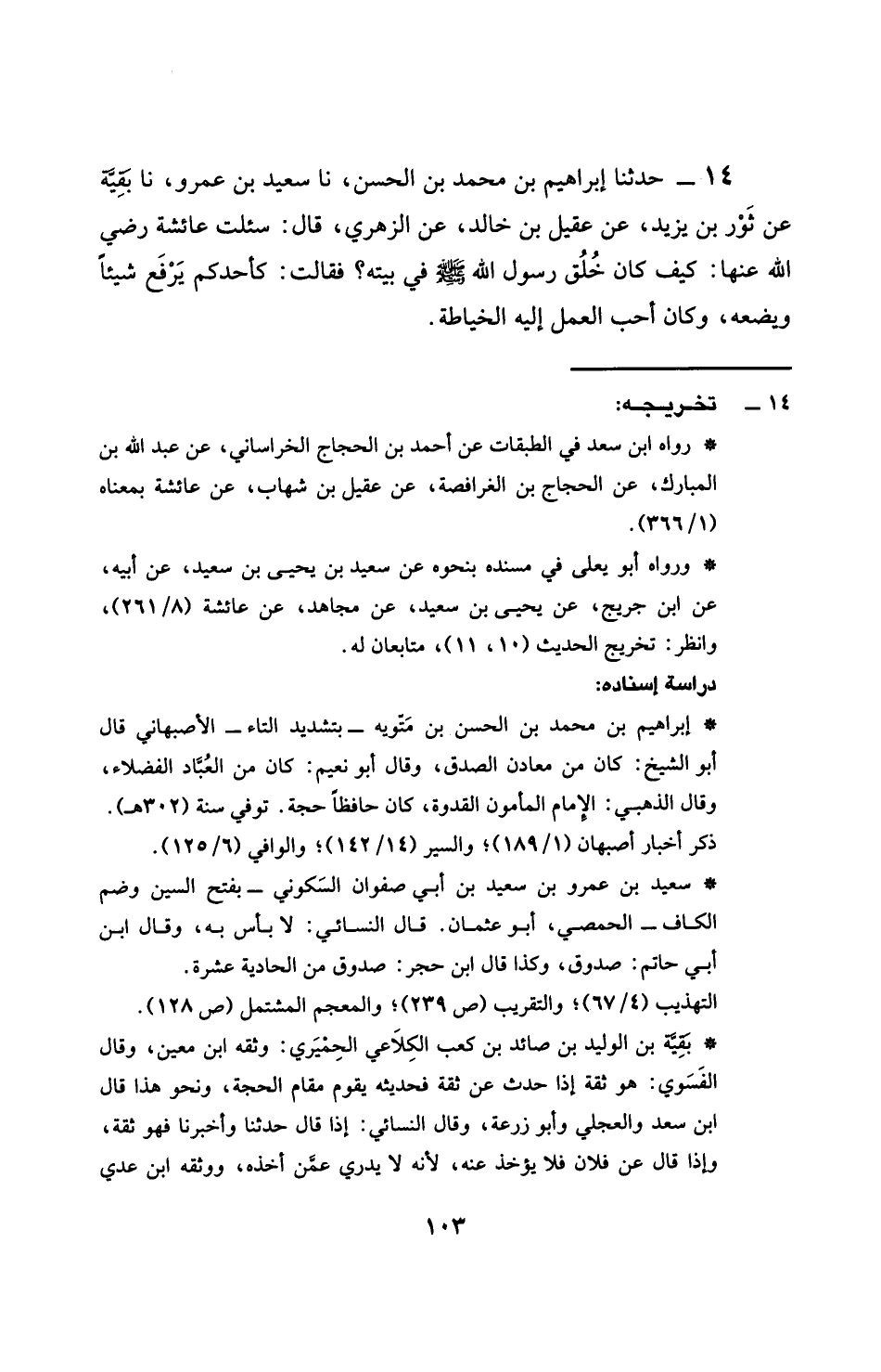14 - حَدَّثَنَا إِبْرَاهِيمُ بْنُ مُحَمَّدِ بْنِ الْحَسَنِ، نَا سَعِيدُ بْنُ عَمْرٍو، نَا بَقِيَّةُ، عَنْ ثَوْرِ بْنِ يَزِيدَ، عَنْ عَقِيلِ بْنِ خَالدٍ، عَنِ الزُّهْرِيِّ، قَالَ: سُئِلَتْ عَائِشَةُ رَضِيَ اللَّهُ عَنْهَا: §كَيْفَ كَانَ خُلُقُ رَسُولِ اللَّهِ صَلَّى اللهُ عَلَيْهِ وَسَلَّمَ فِي بَيْتِهِ؟ فَقَالَتْ: «كَأَحَدِكُمْ يَرْفَعُ شَيْئًا وَيَضَعُهُ، وَكَانَ أَحَبَّ الْعَمَلِ إِلَيْهِ الْخِيَاطَةُ»