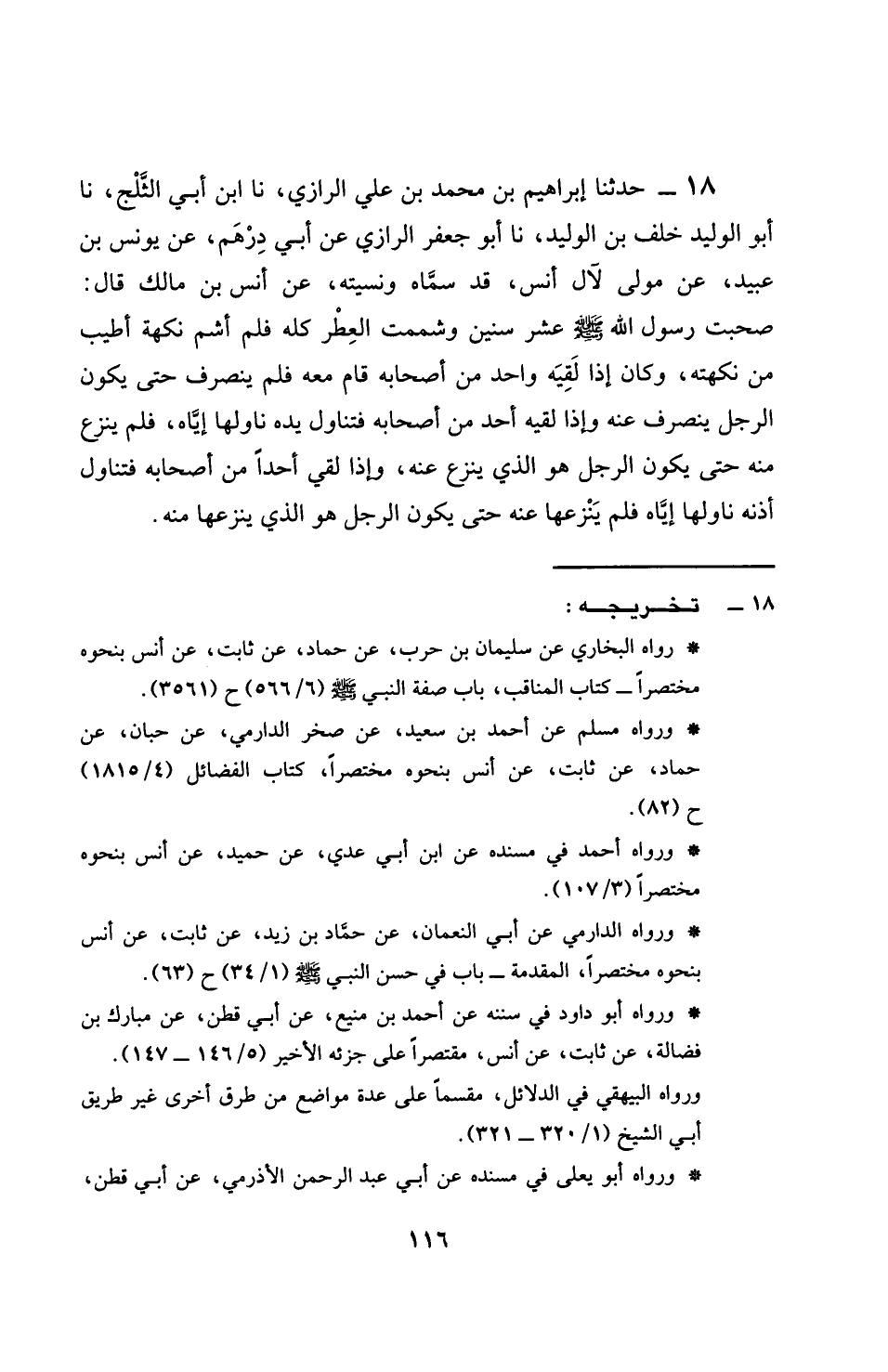 18 - حَدَّثَنَا إِبْرَاهِيمُ بْنُ مُحَمَّدِ بْنِ عَلِيٍّ الرَّازِيُّ، نَا ابْنُ أَبِي الثَّلْجِ، نَا أَبُو الْوَلِيدِ خَلَفُ بْنُ الْوَلِيدِ، نَا أَبُو جَعْفَرٍ الرَّازِيُّ، عَنْ أَبِي دِرْهَمٍ، عَنْ يُونُسَ بْنِ عُبَيْدٍ، عَنْ مَوْلَى لِآلِ أَنَسٍ - قَدْ سَمَّاهُ وَنَسِيتُهُ - عَنْ أَنَسِ بْنِ مَالِكٍ، قَالَ: §صَحِبْتُ رَسُولَ اللَّهِ صَلَّى اللهُ عَلَيْهِ وَسَلَّمَ عَشْرَ سِنِينَ، وَشَمِمْتُ الْعِطْرَ كُلَّهُ، فَلَمْ أَشُمَّ نَكْهَةً أَطْيَبَ مِنْ نَكْهَتِهِ، وَكَانَ إِذَا لَقِيَهُ وَاحِدٌ مِنْ أَصْحَابِهِ قَامَ مَعَهُ فَلَمْ يَنْصَرِفْ حَتَّى يَكُونَ الرَّجُلُ يَنْصَرِفُ عَنْهُ وَإِذَا لَقِيَهُ أَحَدٌ مِنْ أَصْحَابِهِ، فَتَنَاوَلَ يَدَهُ، نَاوَلَهَا إِيَّاهُ، فَلَمْ يَنْزِعْ مِنْهُ حَتَّى يَكُونَ الرَّجُلُ هُوَ الَّذِي يَنْزِعُ عَنْهُ وَإِذَا لَقِيَهُ أَحَدٌ مِنْ أَصْحَابِهِ فَتَنَاوَلَ أُذُنَهُ، نَاوَلَهَا إِيَّاهُ، فَلَمْ يَنْزِعْهَا عَنْهُ حَتَّى يَكُونَ الرَّجُلُ هُوَ الَّذِي يَنْزِعُهَا مِنْهُ