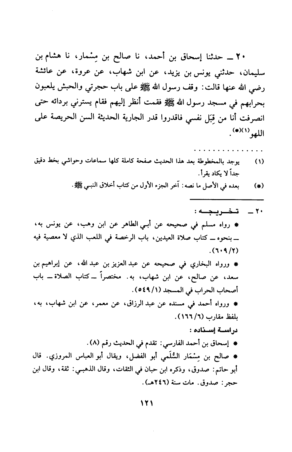20 - حَدَّثَنَا إِسْحَاقُ بْنُ أَحْمَدَ، نَا صَالِحُ بْنُ مِسْمَارٍ، نَا هِشَامُ بْنُ سُلَيْمَانَ، حَدَّثَنِي يُونُسُ بْنُ يَزِيدَ، عَنِ ابْنِ شِهَابٍ، عَنْ عُرْوَةَ، عَنْ عَائِشَةَ، رَضِيَ اللَّهُ عَنْهَا قَالَتْ: §«وَقَفَ رَسُولُ اللَّهِ صَلَّى اللهُ عَلَيْهِ وَسَلَّمَ عَلَى بَابَ حُجْرَتِي، وَالْحَبَشُ يَلْعَبُونَ بِحِرَابِهِمْ فِي مَسْجِدِ رَسُولِ اللهِ صَلَّى اللهُ عَلَيْهِ وَسَلَّمَ فَقُمْتُ أَنْظُرُ إِلَيْهِمْ، فَقَامَ يَسْتُرُنِي بِرِدَائِهِ، حَتَّى انْصَرَفْتُ أَنَا مِنْ قِبَلِ نَفْسِي، فَاقْدُرُوا قَدْرَ الْجَارِيَةِ الْحَدِيثَةِ السِّنِّ، الْحَرِيصَةِ عَلَى اللَّهْوِ»