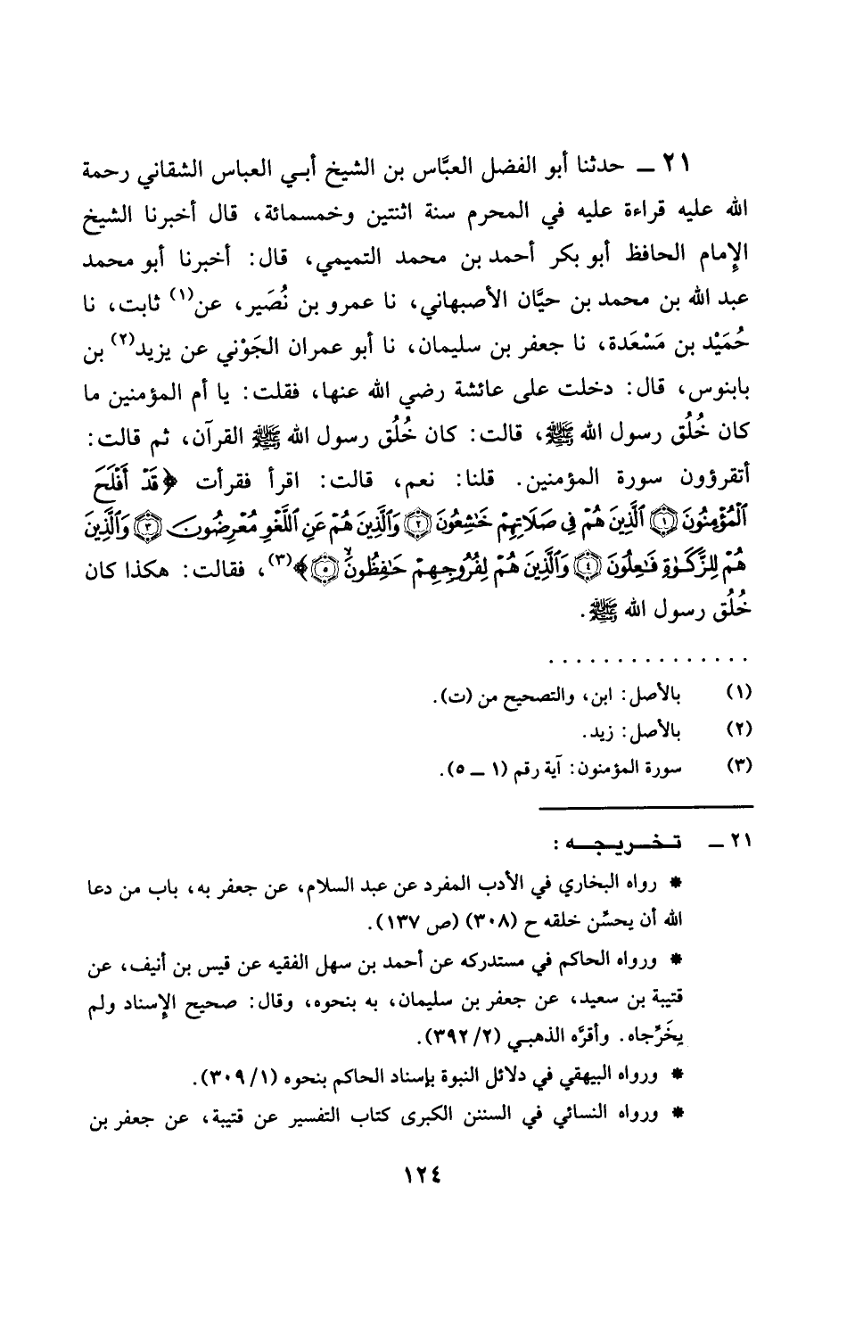 21 - نا أَبُو الْفَضْلِ الْعَبَّاسُ ابْنُ الشَّيْخِ أَبِي الْعَبَّاسِ السَّقَانِيُّ رَحْمَةُ اللَّهِ عَلَيْهِ قِرَاءَةً عَلَيْهِ فِي الْمُحَرَّمِ سَنَةَ اثْنَتَيْنِ وَخَمْسِمِائَةٍ، قَالَ: أَخْبَرَنَا الشَّيْخُ الْإِمَامُ الْحَافِظُ أَبُو بَكْرٍ أَحْمَدُ بْنُ مُحَمَّدٍ التَّمِيمِيُّ، قَالَ: أَخْبَرَنَا أَبُو مُحَمَّدٍ عَبْدُ اللَّهُ بْنُ مُحَمَّدِ بْنِ حَيَّانَ الْأَصْبَهَانِيُّ، نَا عَمْرُو بْنُ نُصَيْرِ بْنِ ثَابِتٍ: نَا حُمَيْدُ بْنُ مَسْعَدَةَ، نَا جَعْفَرُ بْنُ سُلَيْمَانَ، نَا أَبُو عِمْرَانَ الْجَوْنِيُّ، عَنْ يَزِيدَ بْنِ بَابَنُوسَ، قَالَ: دَخَلْتُ عَلَى عَائِشَةَ رَضِيَ اللَّهُ عَنْهَا، فَقُلْتُ: يَا أُمَّ الْمُؤْمِنِينَ، مَا كَانَ خُلُقُ رَسُولِ اللَّهِ صَلَّى اللهُ عَلَيْهِ وَسَلَّمَ؟ قَالَتْ: §كَانَ خُلُقُ رَسُولِ اللَّهِ صَلَّى اللهُ عَلَيْهِ وَسَلَّمَ الْقُرْآنُ، ثُمَّ قَالَتْ أَتَقْرَءُونَ سُورَةَ الْمُؤْمِنِينَ؟ قُلْنَا نَعَمْ، قَالَتِ: اقْرَأْ، فَقَرَأْتُ: {قَدْ أَفْلَحَ الْمُؤْمِنُونَ الَّذِينَ هُمْ فِي صَلَاتِهِمْ خَاشِعُونَ وَالَّذِينَ هُمْ عَنِ اللَّغْوِ مُعْرِضُونَ وَالَّذِينَ هُمْ لِلزَّكَاةِ فَاعِلُونَ وَالَّذِينَ هُمْ لِفُرُوجِهِمْ حَفِظُونَ} فَقَالَتْ: هَكَذَا كَانَ خُلُقُ رَسُولِ اللَّهِ صَلَّى اللهُ عَلَيْهِ وَسَلَّمَ
