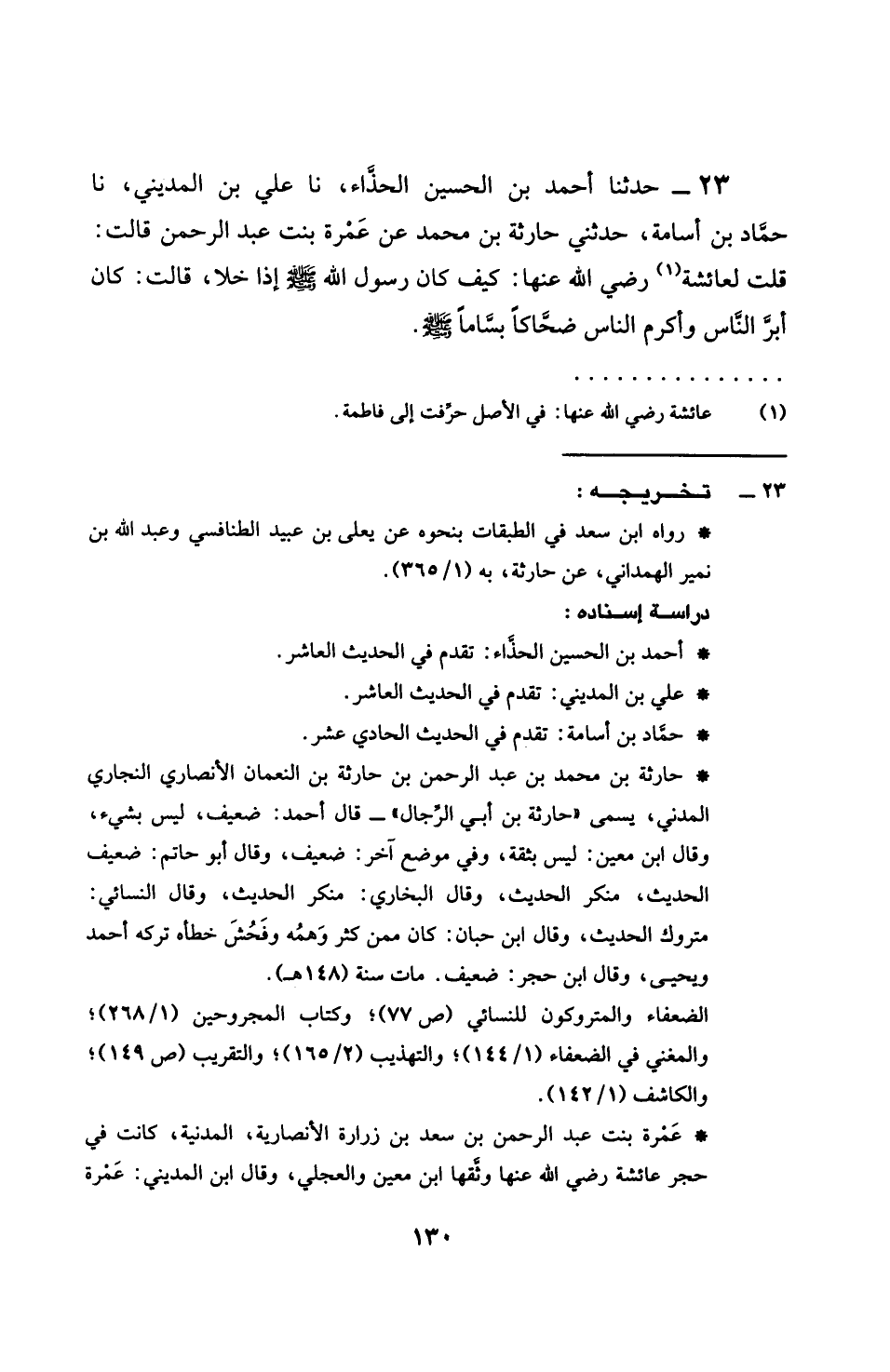 23 - حَدَّثَنَا أَحْمَدُ بْنُ الْحُسَيْنِ الْحَذَّاءُ، نَا عَلِيُّ بْنُ الْمَدِينِيِّ، نَا حَمَّادُ بْنُ أُسَامَةَ، حَدَّثَنِي حَارِثَةُ بْنُ مُحَمَّدٍ، عَنْ عَمْرَةَ بِنْتِ عَبْدِ الرَّحْمَنِ، قَالَتْ: قُلْتُ لِعَائِشَةَ رَضِيَ اللَّهُ عَنْهَا: كَيْفَ كَانَ رَسُولُ اللَّهِ صَلَّى اللهُ عَلَيْهِ وَسَلَّمَ إِذَا خَلَا؟ قَالَتْ: كَانَ §أَبَرَّ النَّاسِ، وَأَكْرَمَ النَّاسِ، ضَحَّاكًا بَسَّامًا، صَلَّى اللهُ عَلَيْهِ وَسَلَّمَ
