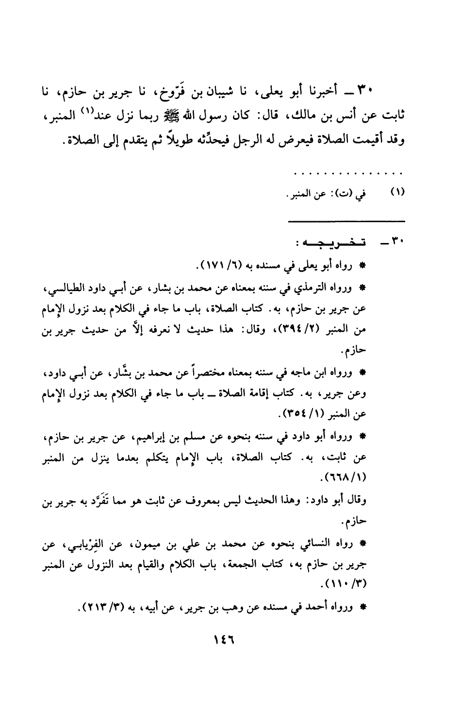 30 - أَخْبَرَنَا أَبُو يَعْلَى، نَا شَيْبَانُ بْنُ فَرُّوخَ، نَا جَرِيرُ بْنُ حَازِمٍ، نَا ثَابِتٌ، عَنْ أَنَسِ بْنِ مَالِكٍ، قَالَ: كَانَ رَسُولُ اللَّهِ صَلَّى اللهُ عَلَيْهِ وَسَلَّمَ §رُبَّمَا نَزَلَ عِنْدَ الْمِنْبَرِ، وَقَدْ أُقِيمَتِ الصَّلَاةُ، فَيُعْرِضُ لَهُ الرَّجُلُ فَيُحَدِّثُهُ طَوِيلًا ثُمَّ يَتَقَدَّمُ إِلَى الصَّلَاةِ