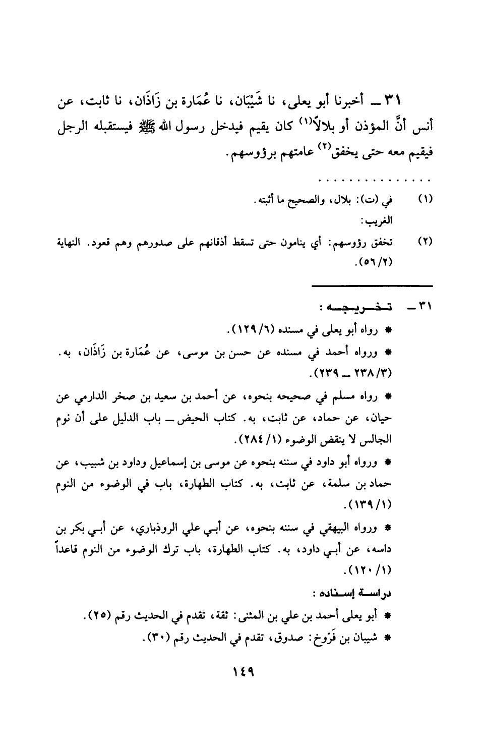 31 - أَخْبَرَنَا أَبُو يَعْلَى، نَا شَيْبَانُ، نَا عُمَارَةُ بْنُ زَاذَانَ، نَا ثَابِتٌ، عَنْ أَنَسٍ، §أَنَّ الْمُؤَذِّنَ، أَوْ بِلَالًا كَانَ يُقِيمُ فَيَدْخُلُ رَسُولَ اللَّهِ صَلَّى اللهُ عَلَيْهِ وَسَلَّمَ، فَيَسْتَقْبِلُهُ الرَّجُلُ، فَيُقِيمُ مَعَهُ حَتَىَ يَخْفِقُ عَامَّتُهُمْ بِرُءُوسِهِمْ