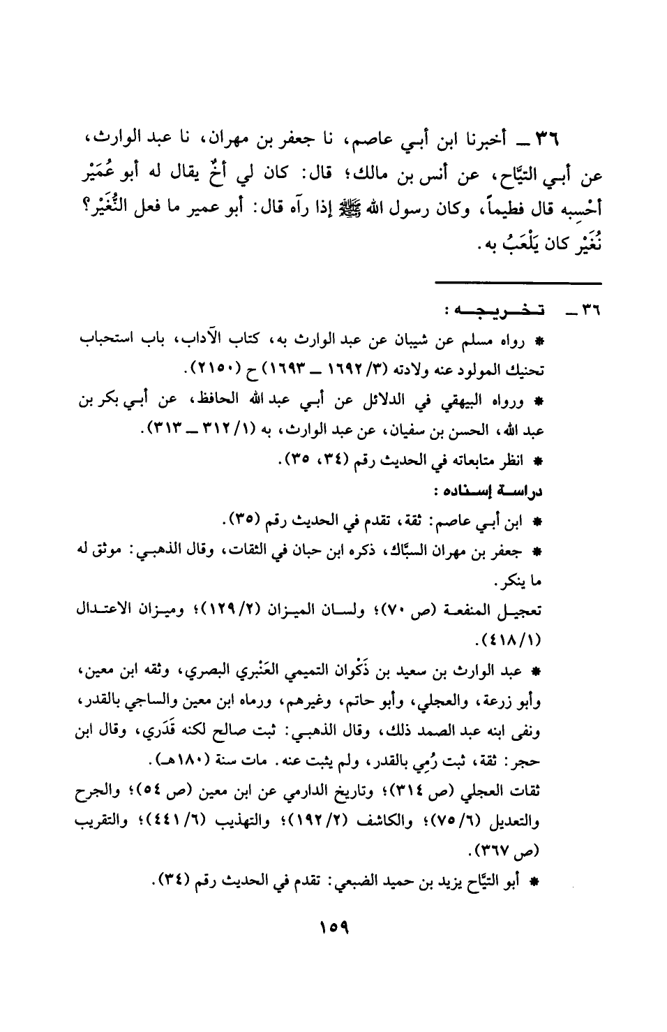 36 - أَخْبَرَنَا ابْنُ أَبِي عَاصِمٍ، نَا جَعْفَرُ بْنُ مِهْرَانَ، نَا عَبْدُ الْوَارِثِ، عَنْ أَبِي التَّيَّاحِ، عَنْ أَنَسِ بْنِ مَالِكٍ، قَالَ: §كَانَ لِي أَخٌ يُقَالُ لَهُ: أَبُو عُمَيْرٍ أَحْسِبُهُ قَالَ: فَطِيمًا وَكَانَ رَسُولُ اللَّهِ صَلَّى اللهُ عَلَيْهِ وَسَلَّمَ إِذَا رَآهُ، قَالَ: أَبُو عُمَيْرٍ، مَا فَعَلَ النُّغَيْرُ؟ نُغِيرٌ كَانَ يَلْعَبُ بِهِ