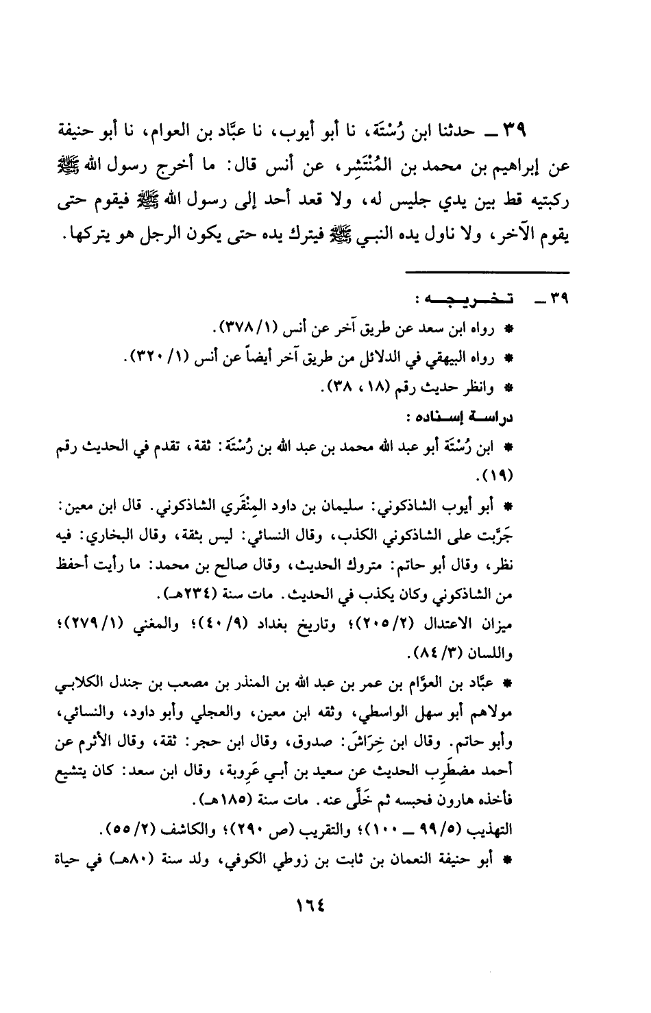 39 - حَدَّثَنَا ابْنُ رُسْتَةَ، نَا أَبُو أَيُّوبُ، نَا عَبَّادُ بْنُ الْعَوَّامِ، نَا أَبُو حَنِيفَةَ، عَنْ إِبْرَاهِيمَ بْنِ مُحَمَّدِ بْنِ الْمُنْتَشِرِ، عَنْ أَنَسٍ، قَالَ: §مَا أَخْرَجَ رَسُولُ اللَّهِ صَلَّى اللهُ عَلَيْهِ وَسَلَّمَ رُكْبَتَيْهِ قَطُّ بَيْنَ يَدَيْ جَلِيسٍ لَهُ، وَلَا قَعَدَ أَحَدٌ إِلَى رَسُولِ اللَّهِ صَلَّى اللهُ عَلَيْهِ وَسَلَّمَ فَيَقُومُ حَتَّى يَقُومَ الْآخَرُ، وَلَا نَاوَلَ يَدَهُ النَّبِيَّ صَلَّى اللهُ عَلَيْهِ وَسَلَّمَ فَيُتْرُكُ يَدَهُ حَتَّى يَكُونَ الرَّجُلُ هُوَ يَتْرُكُهَا