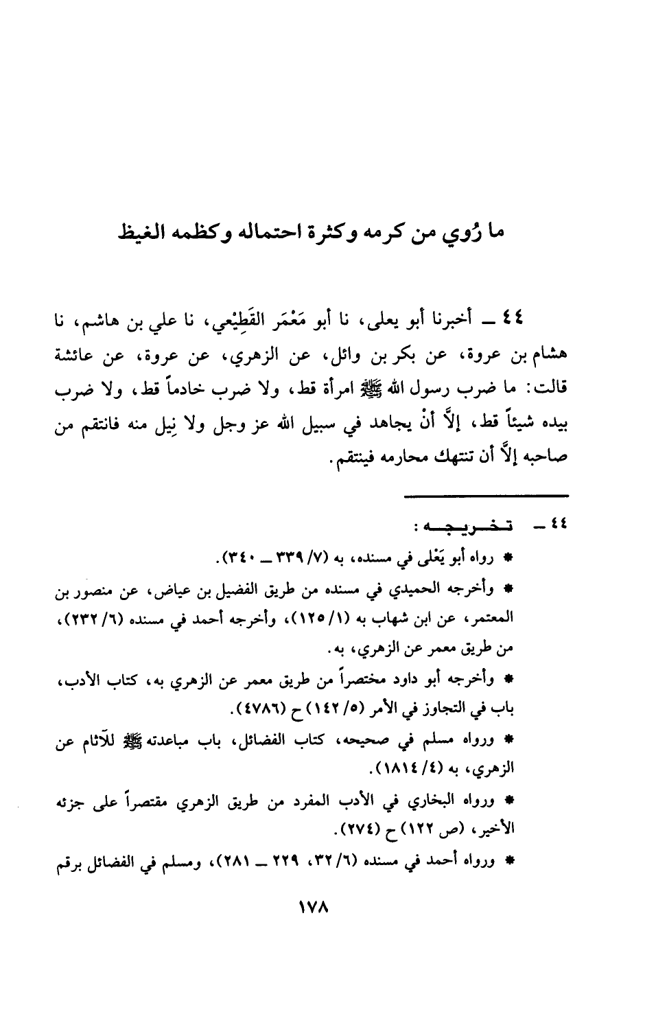 44 - أَخْبَرَنَا أَبُو يَعْلَى، نَا أَبُو مَعْمَرٍ الْقَطِيعِيُّ، نَا عَلِيُّ بْنُ هَاشِمٍ، نَا هِشَامُ بْنُ عُرْوَةَ، عَنْ أَبِيهِ، عَنْ عَائِشَةَ، رَضِيَ اللَّهُ عَنْهَا قَالَتْ: «§مَا ضَرَبَ النَّبِيُّ صَلَّى اللهُ عَلَيْهِ وَسَلَّمَ امْرَأَةً قَطُّ، وَلَا ضَرَبَ خَادِمًا قَطُّ، وَلَا ضَرَبَ بِيَدِهِ شَيْئًا قَطُّ، إِلَّا أَنْ يُجَاهِدَ فِي سَبِيلِ اللَّهِ عَزَّ وَجَلَّ وَلَا نِيلَ مِنْهُ فَانْتَقَمَ مِنْ صَاحِبِهِ، إِلَّا أَنْ تُنْتَهَكَ مَحَارِمُهُ فَيَنْتَقِمُ»
