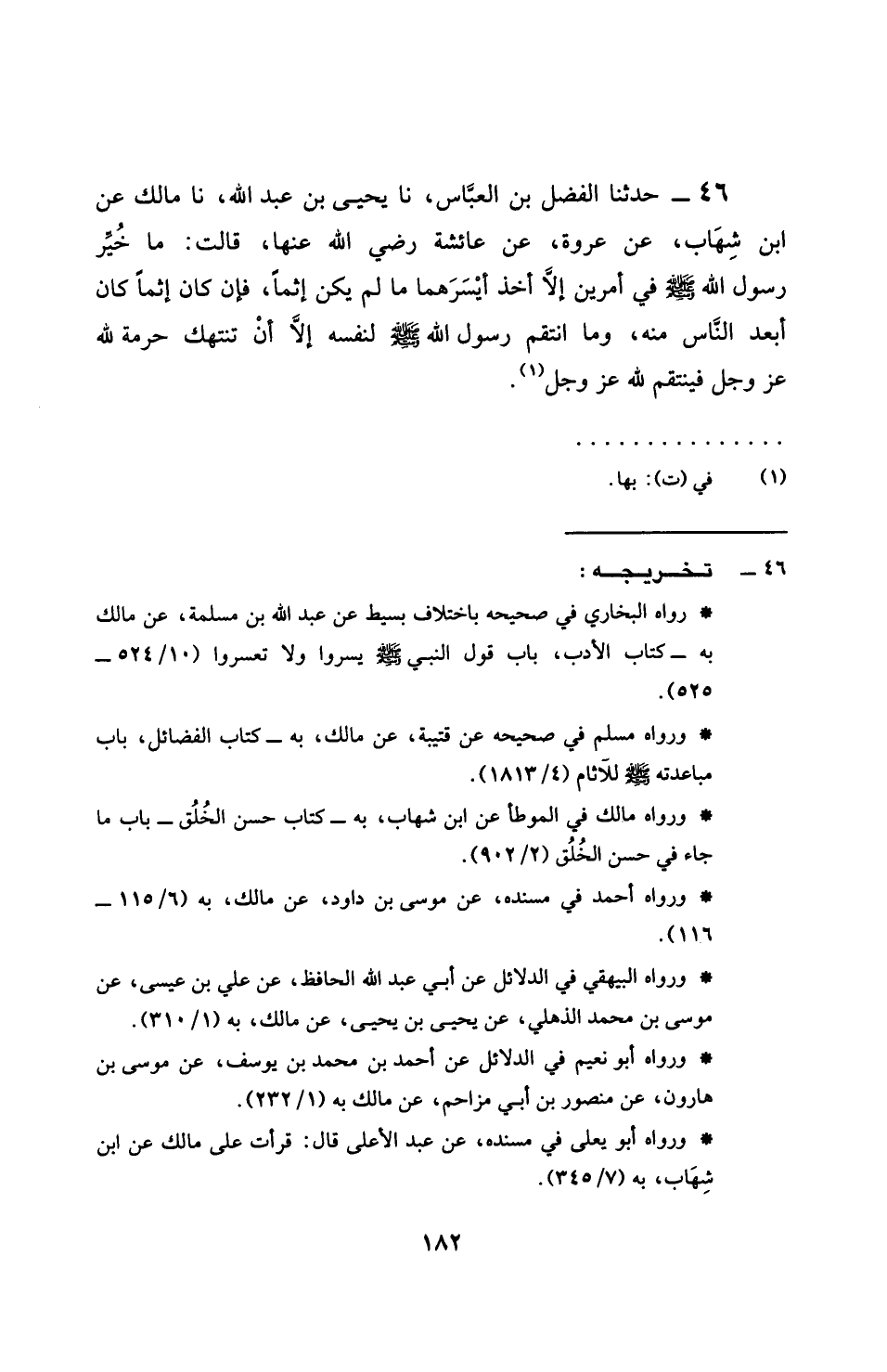 46 - حَدَّثَنَا الْفَضْلُ بْنُ الْعَبَّاسِ، نَا يَحْيَى بْنُ عَبْدِ اللَّهِ، نَا مَالِكٌ، عَنِ ابْنِ شِهَابٍ، عَنْ عُرْوَةَ، عَنْ عَائِشَةَ، رَضِيَ اللَّهُ عَنْهَا قَالَتْ: §مَا خُيِّرَ رَسُولُ اللَّهِ صَلَّى اللهُ عَلَيْهِ وَسَلَّمَ فِي أَمْرَيْنِ إِلَّا اخْتَارَ أَيْسَرَهُمَا، مَا لَمْ يَكُنْ إِثْمًا فِإِنْ كَانَ إِثْمًا كَانَ أَبْعَدَ النَّاسِ مِنْهُ، وَمَا انْتَقَمَ رَسُولُ اللَّهِ صَلَّى اللهُ عَلَيْهِ وَسَلَّمَ لِنَفْسِهِ، إِلَّا أَنْ تُنْتَهَكَ حُرْمَةُ اللَّهِ عَزَّ وَجَلَّ