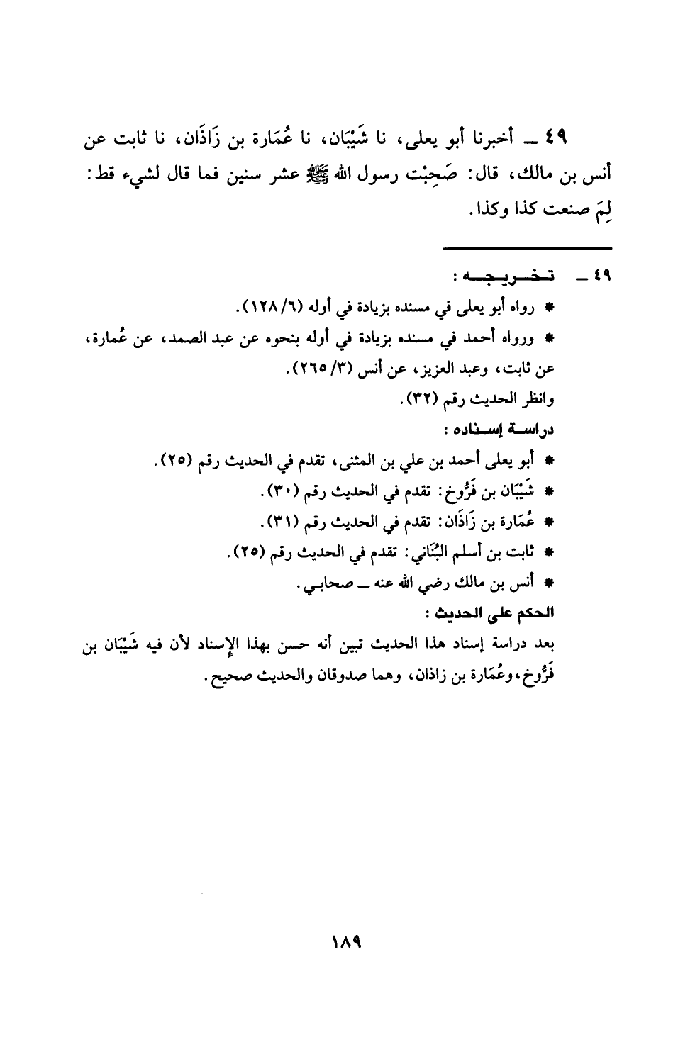 49 - أَخْبَرَنَا أَبُو يَعْلَى، نَا شَيْبَانُ، نَا عُمَارَةُ بْنُ زَاذَانَ، نَا ثَابِتُ، عَنْ أَنَسِ بْنِ مَالِكٍ، قَالَ: §صَحِبْتُ رَسُولَ اللَّهِ صَلَّى اللهُ عَلَيْهِ وَسَلَّمَ عَشْرَ سِنِينَ، فَمَا قَالَ لِشَيْءٍ قَطُّ: لِمَ صَنَعْتَ كَذَا وَكَذَا؟