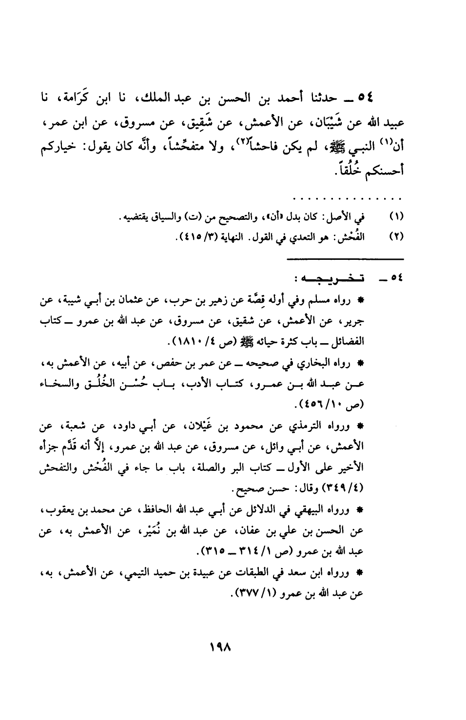 54 - حَدَّثَنَا أَحْمَدُ بْنُ الْحَسَنِ بْنِ عَبْدِ الْمَلِكِ، نَا ابْنُ كَرَامَةَ، نَا عَبْدُ اللَّهِ، عَنْ شَيْبَانَ، عَنِ الْأَعْمَشِ، عَنْ شَقِيقٍ، عَنْ مَسْرُوقٍ، عَنِ ابْنِ عُمَرَ: " كَانَ النَّبِيُّ صَلَّى اللهُ عَلَيْهِ وَسَلَّمَ، §لَمْ يَكُنْ فَاحِشًا وَلَا مُتَفَحِّشًا، وَإِنَّهُ كَانَ يَقُولُ: خِيَارُكُمْ أَحْسَنُكُمْ خُلُقًا "