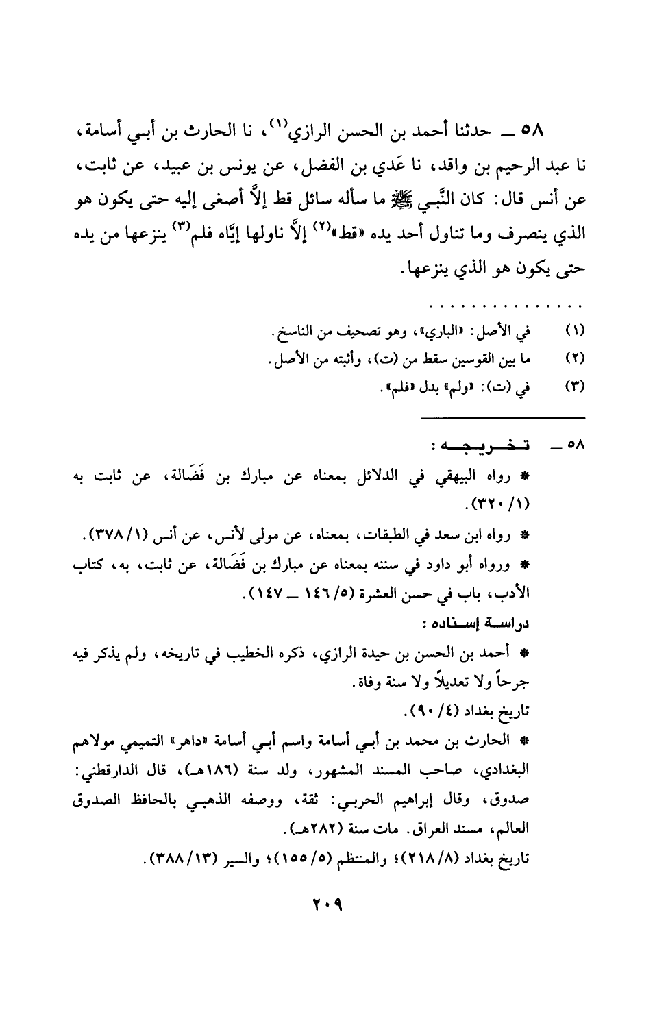 58 - حَدَّثَنَا أَحْمَدُ بْنُ الْحَسَنِ الرَّازِيُّ، نَا الْحَارِثُ بنُ أَبِي أُسَامَةَ، نَا عَبْدُ الرَّحِيمِ بْنُ وَاقِدٍ، نَا عَدِيُّ بْنُ الْفَضْلِ، عَنْ يُونُسَ بنْ عُبَيْدٍ، عَنْ ثَابِتٍ، عَنْ أَنَسٍ، قَالَ: «كَانَ النَّبِيُّ صَلَّى اللهُ عَلَيْهِ وَسَلَّمَ §مَا سَأَلَهُ سَائِلٌ قَطُّ إِلَّا أَصْغَى إِلَيْهِ حَتَّى يَكُونَ هُوَ الَّذِي يَنْصَرِفُ، وَمَا تَنَاوَلَ أَحَدٌ يَدَهُ قَطُّ إِلَّا نَاوَلَهَا إِيَّاهُ، فَلَمْ يَنْزِعْهَا مِنْ يَدِهِ حَتَّى يَكُونَ هُوَ الَّذِي يَنْزِعُهَا»