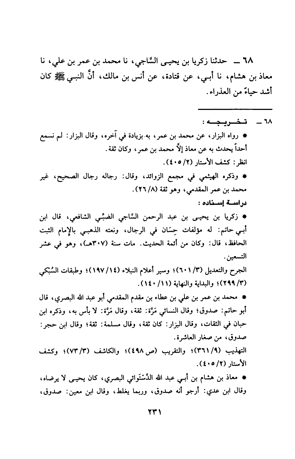 68 - حَدَّثَنَا زَكَرِيَّا بْنُ يَحْيَى السَّاجِيُّ، نَا مُحَمَّدُ بْنُ عُمَرَ بْنِ عَلِيٍّ، نَا مُعَاذُ بْنُ هِشَامٍ، نَا أَبِي، عَنْ قَتَادَةَ، عَنْ أَنَسِ بْنِ مَالِكٍ، أَنَّ النَّبِيَّ صَلَّى اللهُ عَلَيْهِ وَسَلَّمَ كَانَ §أَشَدَّ حَيَاءً مِنَ الْعَذْرَاءِ