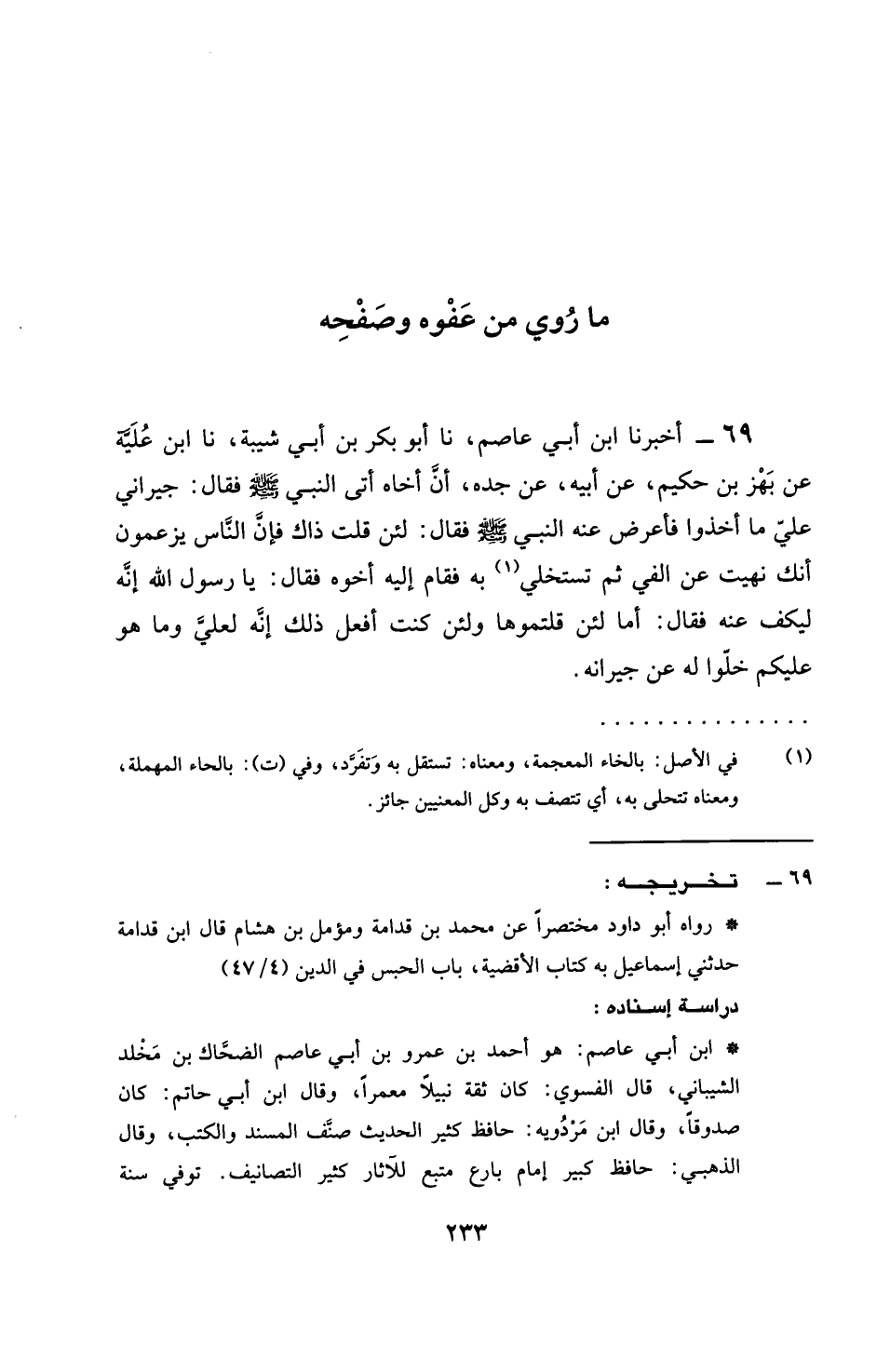 69 - أَخْبَرَنَا ابْنُ أَبِي عَاصِمٍ، نَا أَبُو بَكْرِ بْنُ أَبِي شَيْبَةَ، نَا ابْنُ عُلَيَّةَ، عَنْ بَهْزِ بْنِ حَكِيمٍ، عَنْ أَبِيهِ، عَنْ جَدِّهِ، " §أَنَّ أَخَاهُ أَتَى النَّبِيَّ صَلَّى اللهُ عَلَيْهِ وَسَلَّمَ، فَقَالَ: جِيرَانِي عَلَى مَا أَخَذُوا مَعِي؟ فَأَعْرَضَ عَنْهُ النَّبِيُّ صَلَّى اللهُ عَلَيْهِ وَسَلَّمَ، فَقَالَ: لَئِنْ قُلْتَ ذَاكَ، فَإِنَّ النَّاسَ يَزْعُمُونَ أَنَّكَ نُهِيتَ عَنِ الْغَيِّ، ثُمَّ تَسْتَخْلِي بِهِ، فَقَامَ إِلَيْهِ أَخُوهُ، فَقَالَ: يَا رَسُولَ اللَّهِ، إِنَّهُ لَيَكُفَّ عَنْهُ، فَقَالَ: أَمَا لَئِنْ قُلْتُمُوهَا، وَلَئِنْ كُنْتُ أَفْعَلُ ذَلِكَ، إِنَّهُ لَعَلَيَّ، وَمَا هُوَ عَلَيْكُمْ، خَلُّوا لَهُ عَنْ جِيرَانِهِ "