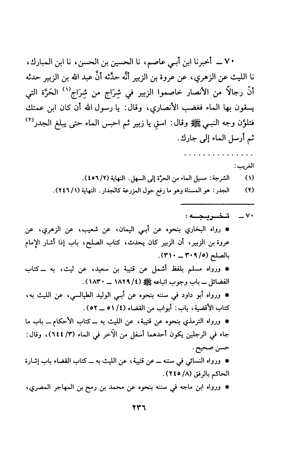 70 - أَخْبَرَنَا ابْنُ أَبِي عَاصِمٍ، نَا الْحُسَيْنُ بْنُ الْحَسَنِ، نَا ابْنُ الْمُبَارَكِ، نَا اللَّيْثُ، عَنِ الزُهْرِيِّ، عَنْ عُرْوَةَ بْنِ الزُّبَيْرِ، أَنَّهُ حَدَّثَهُ، أَنَّ عَبْدَ اللَّهِ بْنَ الزُّبَيْرِ حَدَّثَهُ: §أَنَّ رِجَالًا مِنَ الْأَنْصَارِ، خَاصَمُوا الزُّبَيْرَ فِي شَرْجٍ مِنْ شِرَاجِ الْحَرَّةِ الَّتِي يَسْقُونَ بِهَا الْمَاءَ، فَغَضِبَ الْأَنْصَارِيُّ، وَقَالَ: يَا رَسُولَ اللَّهِ، أَنْ كَانَ ابْنَ عَمَّتِكَ، فَتَلَوَّنَ وَجْهُ النَّبِيِّ صَلَّى اللهُ عَلَيْهِ وَسَلَّمَ، وَقَالَ: اسْقِ يَا زُبَيْرُ، ثُمَّ احْبِسِ الْمَاءَ، حَتَّى يَبْلُغَ الْجَدْرَ، ثُمَّ أَرْسِلِ الْمَاءَ إِلَى جَارِكَ