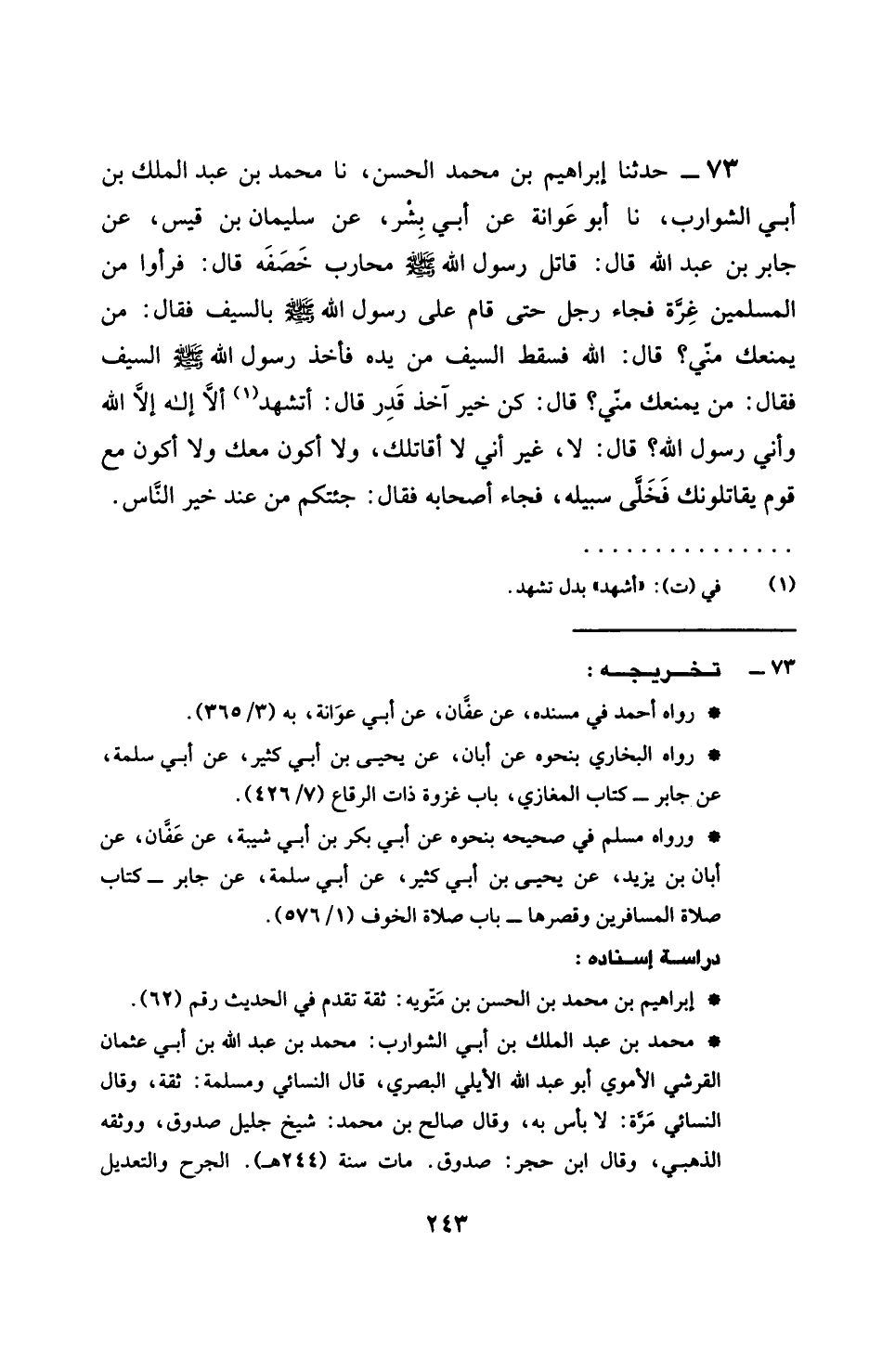 73 - حَدَّثَنَا إِبْرَاهِيمُ بْنُ مُحَمَّدِ بْنِ الْحَسَنِ، نَا مُحَمَّدُ بْنُ عَبْدِ الْمَلِكِ بْنِ أَبِي الشَّوَارِبِ، نَا أَبُو عَوَانَةَ، عَنْ أَبِي بِشْرٍ، عَنْ سُلَيْمَانَ بْنِ قَيْسٍ، عَنْ جَابِرِ بْنِ عَبْدِ اللَّهِ، قَالَ: §قَاتَلَ رَسُولُ اللَّهِ صَلَّى اللهُ عَلَيْهِ وَسَلَّمَ مُحَارِبَ بْنَ خَصَفَةَ، فَرَأَوْا مِنَ الْمُسْلِمِينَ غِرَّةً، فَجَاءَ رَجُلٌ حَتَّى قَامَ عَلَى رَسُولُ اللَّهِ صَلَّى اللهُ عَلَيْهِ وَسَلَّمَ بِالسَّيْفِ، فَقَالَ: مَنْ يَمْنَعُكَ مِنِّي؟ قَالَ: اللَّهُ، فَسَقَطَ السَّيْفُ مِنْ يَدِهِ، فَأَخَذَ رَسُولُ اللَّهِ صَلَّى اللهُ عَلَيْهِ وَسَلَّمَ السَّيْفَ، فَقَالَ: مَنْ يَمْنَعُكَ مِنِّي؟ قَالَ: كُنْ خَيْرَ آخِذٍ قَدَرَ، قَالَ: أَتَشْهَدُ أَلَّا إِلَهَ إِلَّا اللَّهُ، وَأَنِّي رَسُولُ اللَّهِ؟ قَالَ: لَا، غَيْرَ أَنِّي لَا أُقَاتِلُكَ، وَلَا أَكُونُ مَعَكَ، وَلَا أَكُونُ مَعَ قَوْمٍ يُقَاتِلُونَكَ، فَخَلَّى سَبِيلَهُ، فَجَاءَ أَصْحَابُهُ، فَقَالَ: جِئْتُكُمْ مِنْ عِنْدِ خَيْرِ النَّاسِ