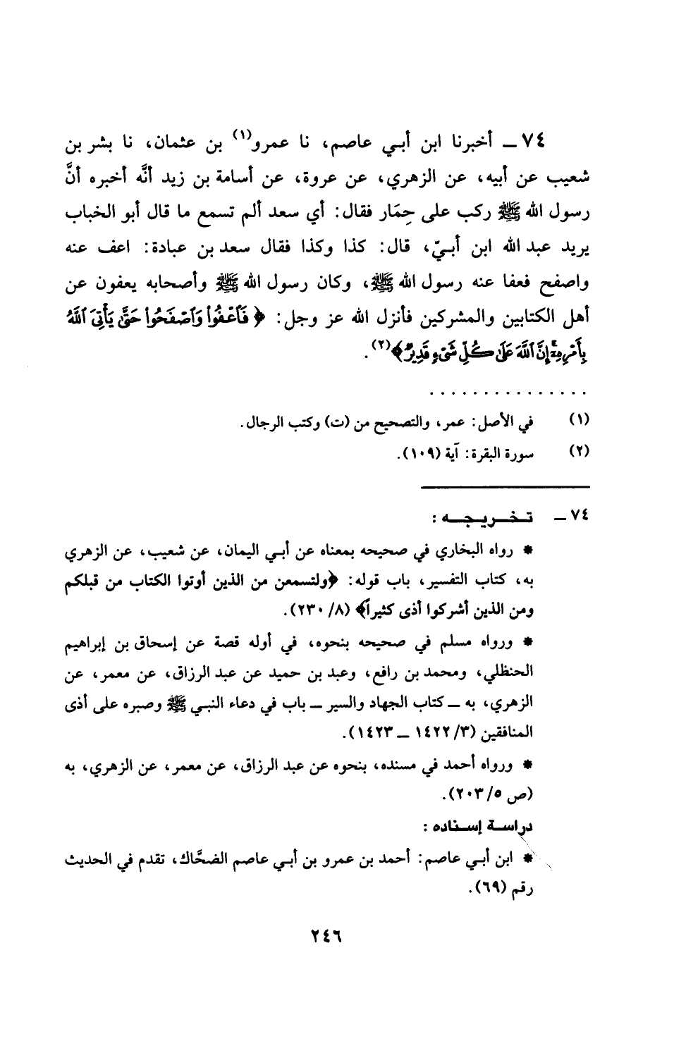 74 - أَخْبَرَنَا ابْنُ أَبِي عَاصِمٍ، نَا عَمْرُو بْنُ عُثْمَانَ، نَا بِشْرُ بْنُ سَعِيدٍ، عَنْ أَبِيهِ، عَنِ الزُهْرِيِّ، عَنْ عُرْوَةَ، عَنْ أُسَامَةَ بْنِ زَيْدٍ، أَنَّهُ أَخْبَرَهُ §أَنَّ رَسُولُ اللَّهِ صَلَّى اللهُ عَلَيْهِ وَسَلَّمَ رَكِبَ عَلَى حِمَارٍ، فَقَالَ لِسَعدٍ: أَلَمْ تَسْمَعْ مَا قَالَ أَبُو الْحُبَابِ؟ يُرِيدُ عَبْدَ اللَّهِ بْنَ أُبَيٍّ، قَالَ: كَذَا وَكَذَا، فَقَالَ سَعْدُ بْنُ عُبَادَةَ: اعْفُ عَنْهُ وَاصْفَحْ، فَعَفَا عَنْهُ رَسُولَ اللَّهِ صَلَّى اللهُ عَلَيْهِ وَسَلَّمَ، وَكَانَ رَسُولُ اللَّهِ صَلَّى اللَّهُ عَلَيْهِ وَسَلَّم وَأَصْحَابُهُ يَعْفُونَ عَنْ أَهْلِ الْكِتَابَيْنِ وَالْمُشْرِكِينَ، فَأَنْزَلَ اللَّهُ عَزَّ وَجَلَّ: {فَاعْفُوا وَاصْفَحُوا حَتَّى يَأْتِيَ اللَّهُ بِأَمْرِهِ إِنَّ اللَّهَ عَلَى كُلِّ شَيْءٍ قَدِيرٌ} [البقرة: 109]