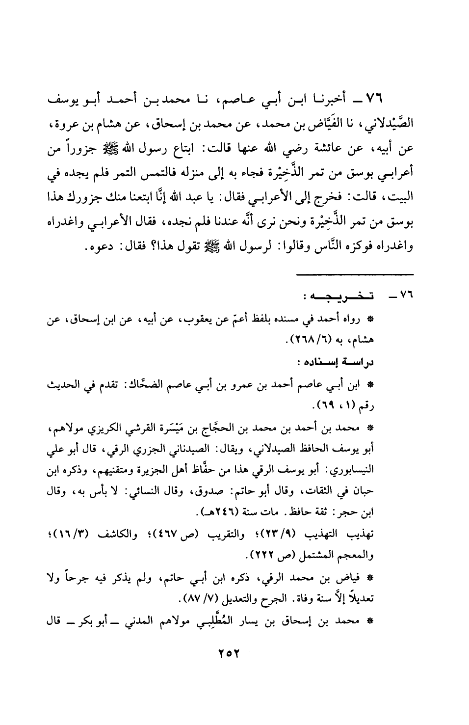 76 - أَخْبَرَنَا ابْنُ أَبِي عَاصِمٍ، نَا مُحَمَّدُ بْنُ أَحْمَدَ أَبُو يُوسُفَ الصَّيْدَلَانِيُّ، نَا الْفَيَّاضُ بْنُ مُحَمَّدٍ، عَنْ مُحَمَّدِ بْنِ إِسْحَاقَ، عَنْ هِشَامِ بْنِ عُرْوَةَ، عَنْ أَبِيهِ، عَنْ عَائِشَةَ، رَضِيَ اللَّهُ عَنْهَا قَالَتِ: §ابْتَاعَ رَسُولُ اللَّهِ صَلَّى اللهُ عَلَيْهِ وَسَلَّمَ جَزُورًا مِنْ أَعْرَابِيٍّ بِوَسْقٍ مِنْ تَمْرِ الذَّخِيرَةِ، فَجَاءَ بِهِ إِلَى مَنْزِلِهِ فَالْتَمَسَ التَّمْرَ فَلَمْ يَجِدْهُ فِي الْبَيْتِ قَالَ: فَخَرَجَ إِلَى الْأَعْرَابِيِّ، فَقَالَ: يَا عَبْدَ اللَّهِ، إِنَّا ابْتَعْنَا مِنْكَ جَزُورَكَ هَذَا بِوَسْقٍ مِنْ تَمْرِ الذَّخِيرَةِ، وَنَحْنُ نَرَى أَنَّهُ عِنْدَنَا، فَلَمْ نَجِدْهُ، فَقَالَ الْأَعْرَابِيُّ: وَاغَدْرَاهُ وَاغَدْرَاهُ فَوَكَزَهُ النَّاسُ، وَقَالُوا: لِرَسُولُ اللَّهِ صَلَّى اللهُ عَلَيْهِ وَسَلَّمَ تَقُولُ هَذَا؟ فَقَالَ: دَعُوهُ