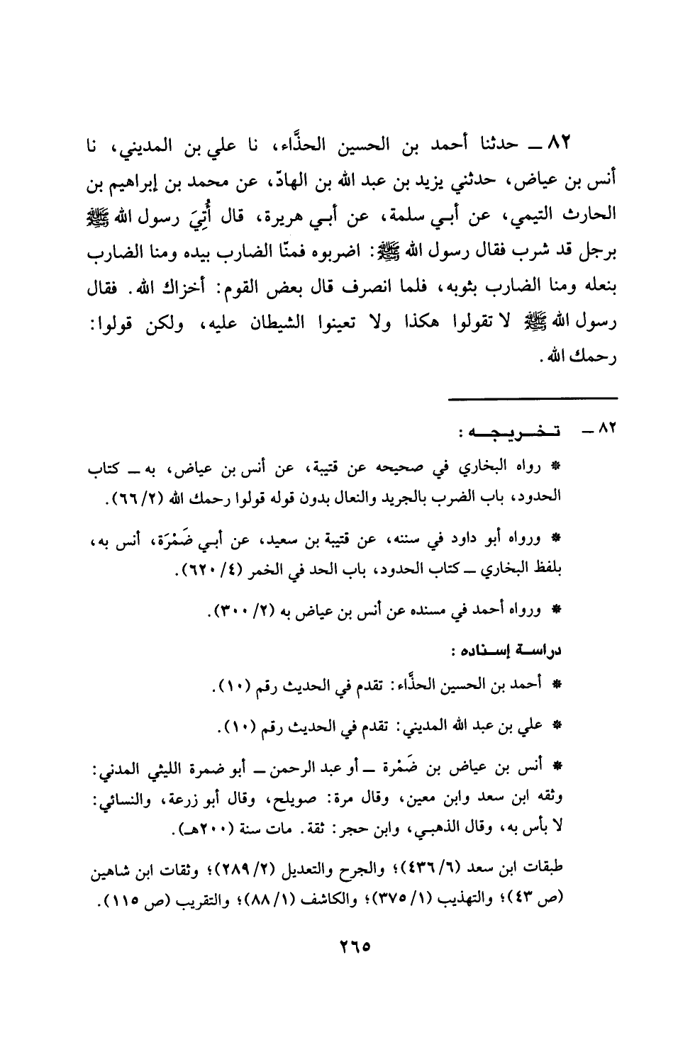 82 - حَدَّثَنَا أَحْمَدُ بْنُ الْحُسَيْنِ الْحَذَّاءُ، نَا عَلِيُّ بْنُ الْمَدِينِيِّ، نَا أَنَسُ بْنُ عِيَاضٍ، حَدَّثَنِي يَزِيدُ بْنُ عَبْدِ اللَّهِ بْنِ الْهَادِ، عَنْ مُحَمَّدِ بْنِ إِبْرَاهِيمَ بْنِ الْحَارِثِ التَّيْمِيِّ، عَنْ أَبَى سَلَمَةَ، عَنْ أَبِي ذَرٍّ، قَالَ: §أُتِيَ رَسُولُ اللَّهِ صَلَّى اللهُ عَلَيْهِ وَسَلَّمَ بِرَجُلٍ قَدْ شَرِبَ، فَقَالَ رَسُولُ اللَّهِ صَلَّى اللهُ عَلَيْهِ وَسَلَّمَ: اضْرِبُوهُ، فَمِنَّا الضَّارِبُ بِيَدِهِ، وَمِنَّا الضَّارِبُ بِنَعْلِهِ، وَمِنَّا الضَّارِبُ بِثَوْبِهِ، فَلَمَّا انْصَرَفَ قَالَ بَعْضُ الْقَوْمِ: أَخْزَاكَ اللَّهُ، فَقَالَ رَسُولُ اللَّهِ صَلَّى اللهُ عَلَيْهِ وَسَلَّمَ: لَا تَقُولُوا هَكَذَا، وَلَا تُعِينُوا الشَّيْطَانَ عَلَيْهِ، وَلَكِنْ قُولُوا: رَحِمَكَ اللَّهُ