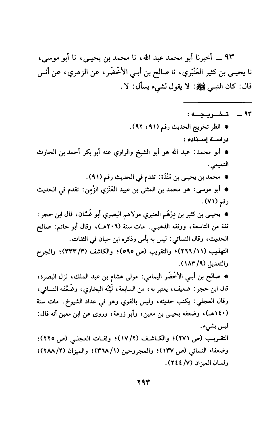 93 - حَدَّثَنَا مُحَمَّدُ بْنُ يَحْيَى، نَا مُحَمَّدُ بْنُ بَشَّارٍ، نَا أَبُو هِشَامٍ الْمُغِيرَةُ بْنُ سَلَمَةَ الْمَخْزُومِيُّ، نَا وُهَيْبٌ، عَنْ مَعْمَرٍ، عَنِ الزُهْرِيِّ، عَنْ عُرْوَةَ، عَنْ عَائِشَةَ، قَالَتْ: §مَا سُئِلَ النَّبِيُّ صَلَّى اللهُ عَلَيْهِ وَسَلَّمَ شَيْئًا قَطُّ فَمَنَعَهُ