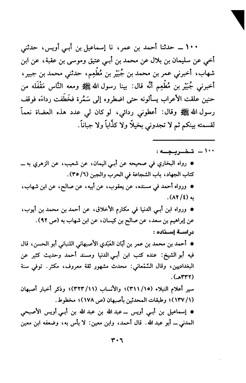 100 - حَدَّثَنَا أَحْمَدُ بْنُ عُمَرَ، نَا إِسْمَاعِيلُ، نَا ابْنُ أَبِي أُوَيْسٍ، حَدَّثَنِي أَخِي، عَنْ سُلَيْمَانَ بْنِ بِلَالٍ، عَنْ مُحَمَّدِ بْنِ أَبِي عَتِيقٍ، وَمُوسَى بْنِ عُقْبَةَ، عَنِ ابْنِ شِهَابٍ، أَخْبَرَنِي عُمَرُ بْنُ مُحَمَّدِ بْنِ جُبَيْرِ بْنِ مُطْعِمٍ، حَدَّثَنِي مُحَمَّدُ بْنُ جُبَيْرٍ، أَخْبَرَنِي جُبَيْرُ بْنُ مُطْعِمٍ، أَنَّهُ قَالَ: §بَيْنَا رَسُولُ اللَّهِ صَلَّى اللهُ عَلَيْهِ وَسَلَّمَ وَمَعَهُ النَّاسُ مُقْفَلهُ مِنْ حُنَيْنٍ عَلِقَتِ الْأَعْرَابُ يَسْأَلُونَهُ، حَتَّى اضْطَرُّوهُ إِلَى سَمُرَةٍ، فَخَطِفَتْ رِدَاءَهُ، فَوَقَفَ رَسُولُ اللَّهِ صَلَّى اللهُ عَلَيْهِ وَسَلَّمَ وَقَالَ: أَعْطُونِي رِدَائِي، لَوْ كَانَ لِي عَدَدُ هَذِهِ الْعِضَاهِ نَعَمًا لَقَسَمْتُهُ بَيْنَكُمْ، ثُمَّ لَا تَجِدُونِي بَخِيلًا، وَلَا كَذَّابًا، وَلَا جَبَانًا