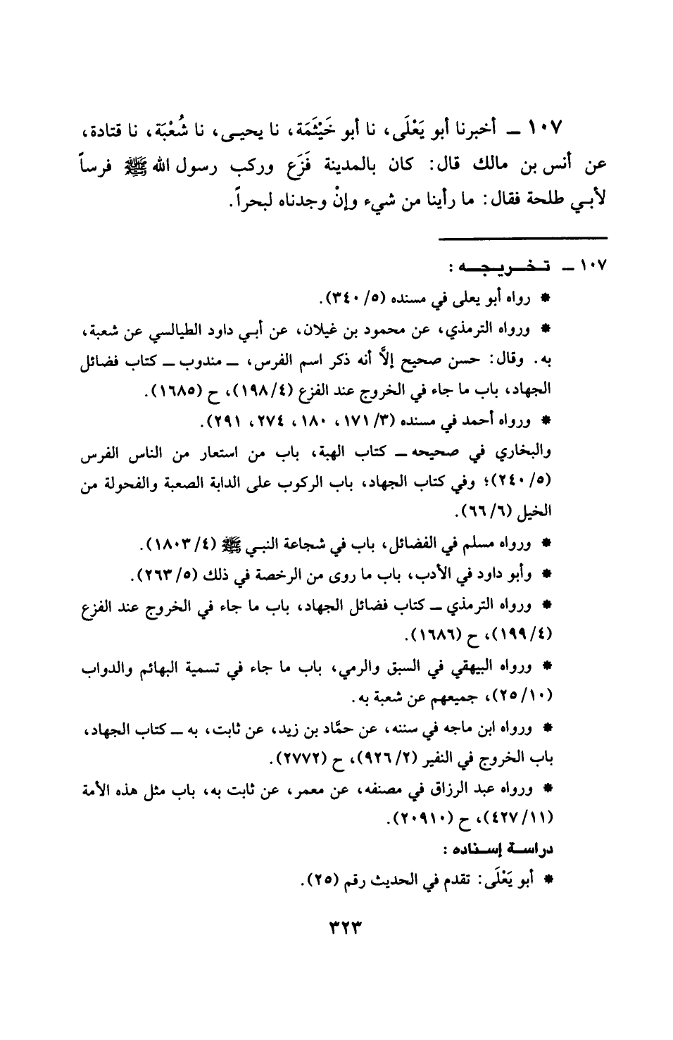 107 - أَخْبَرَنَا أَبُو يَعْلَى، نَا أَبُو خَيْثَمَةَ، نَا يَحْيَى، نَا شُعْبَةُ، نَا قَتَادَةُ، عَنْ أَنَسِ بْنِ مَالِكٍ، قَالَ: كَانَ §بِالْمَدِينَةِ فَزَعٌ، وَرَكِبَ رَسُولُ اللَّهِ صَلَّى اللهُ عَلَيْهِ وَسَلَّمَ فَرَسًا لِأَبِي طَلْحَةَ، فَقَالَ: مَا رَأَيْنَا مِنْ شَيْءٍ، وَإِنْ وَجَدْنَاهُ لَبَحْرًا