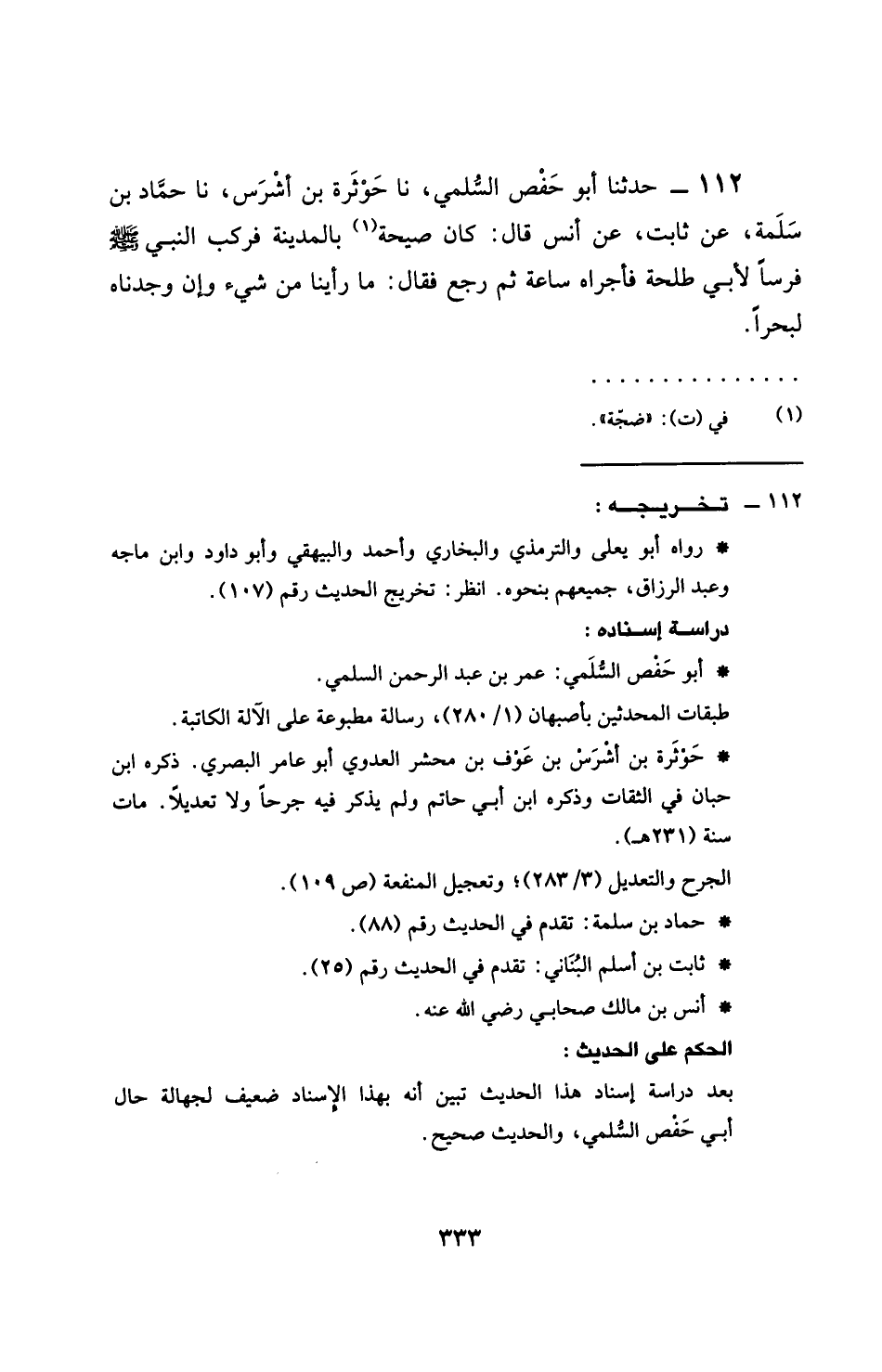 112 - حَدَّثَنَا أَبُو حَفْصٍ السُّلَمِيُّ، نَا حَوْثَرَةُ بْنُ أَشْرَسَ، نَا حَمَّادُ بْنُ سَلَمَةَ، عَنْ ثَابِتٍ، عَنْ أَنَسٍ، قَالَ: " §كَانَ صَيْحَةٌ بِالْمَدِينَةِ، فَرَكِبَ النَّبِيُّ صَلَّى اللهُ عَلَيْهِ وَسَلَّمَ فَرَسًا لِأَبِي طَلْحَةَ، فَأَجْرَاهُ سَاعَةً، ثُمَّ رَجَعَ، فَقَالَ: مَا رَأَيْنَا مِنْ شَيْءٍ، وَإِنْ وَجَدْنَاهُ لَبَحْرًا "