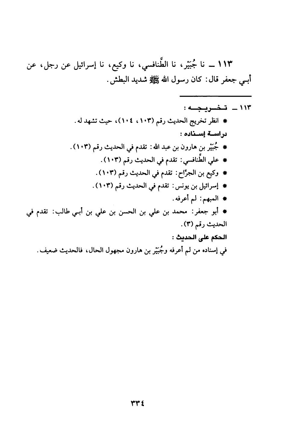 113 - نَا جُبَيْرٌ، نَا الطَّنَافِسِيُّ، نَا وَكِيعٌ، نَا إِسْرَائِيلُ، عَنْ أَبِي جَعْفَرٍ، قَالَ: كَانَ رَسُولُ اللَّهِ صَلَّى اللهُ عَلَيْهِ وَسَلَّمَ §شَدِيدَ الْبَطْشِ