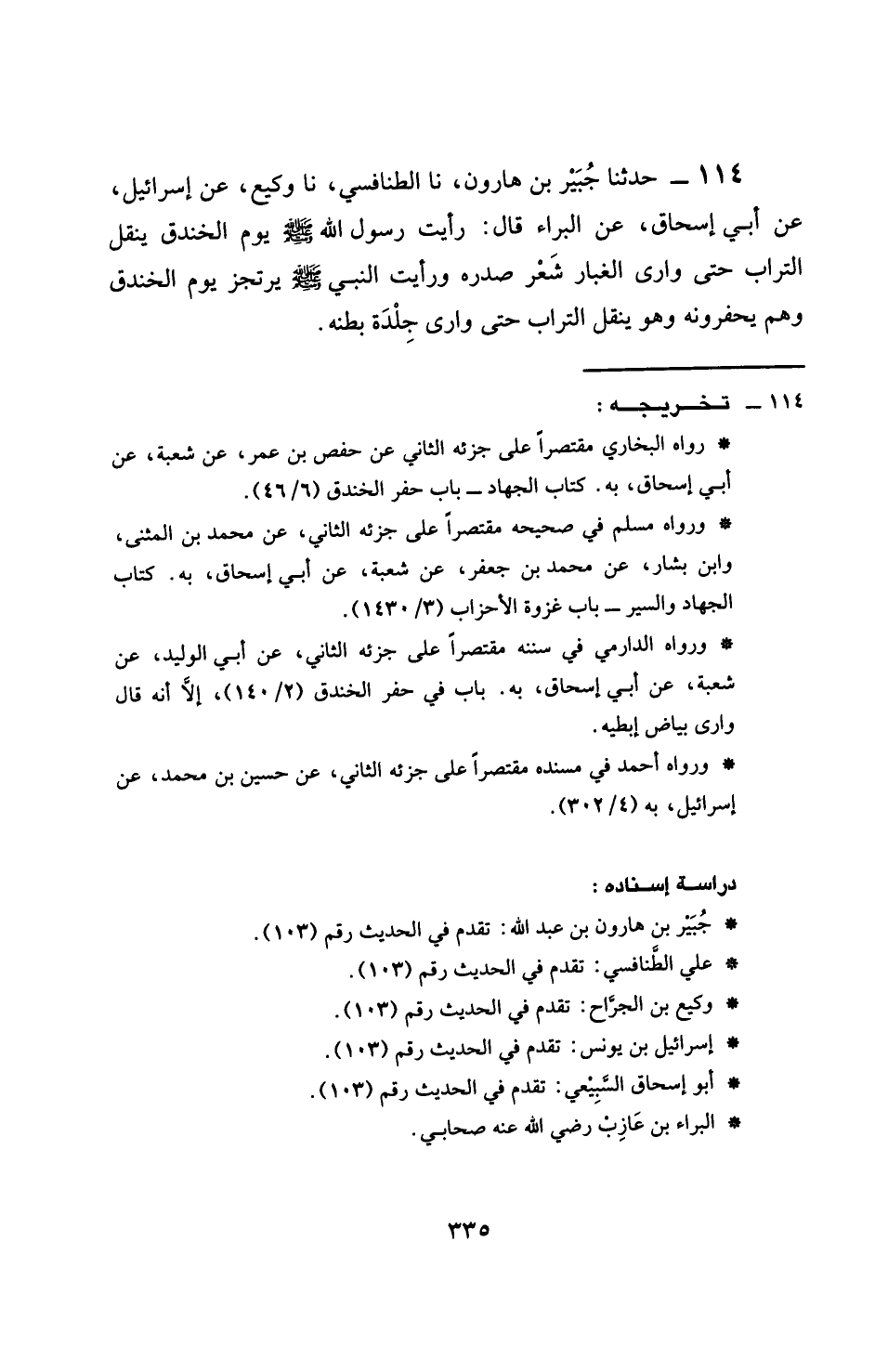 114 - حَدَّثَنَا جُبَيْرُ بْنُ هَارُونَ، نَا الطَّنَافِسِيُّ، نَا وَكِيعٌ، عَنْ إِسْرَائِيلَ، عَنْ أَبِي إِسْحَاقَ، عَنِ الْبَرَاءِ، قَالَ: §رَأَيْتُ رَسُولَ اللَّهِ صَلَّى اللهُ عَلَيْهِ وَسَلَّمَ يَوْمَ الْخَنْدَقِ، يَنْقُلُ التُّرَابَ حَتَّى وَارَى الْغُبَارُ شَعَرَ صَدْرِهِ، وَرَأَيْتُ النَّبِيَّ صَلَّى اللهُ عَلَيْهِ وَسَلَّمَ يَرْتَجِزُ يَوْمَ الْخَنْدَقِ وَهُمْ يَحْفِرُونَهُ، وَهُوَ يَنْقُلُ التُّرَابَ حَتَّى وَارَى جِلْدَةَ بَطْنِهِ