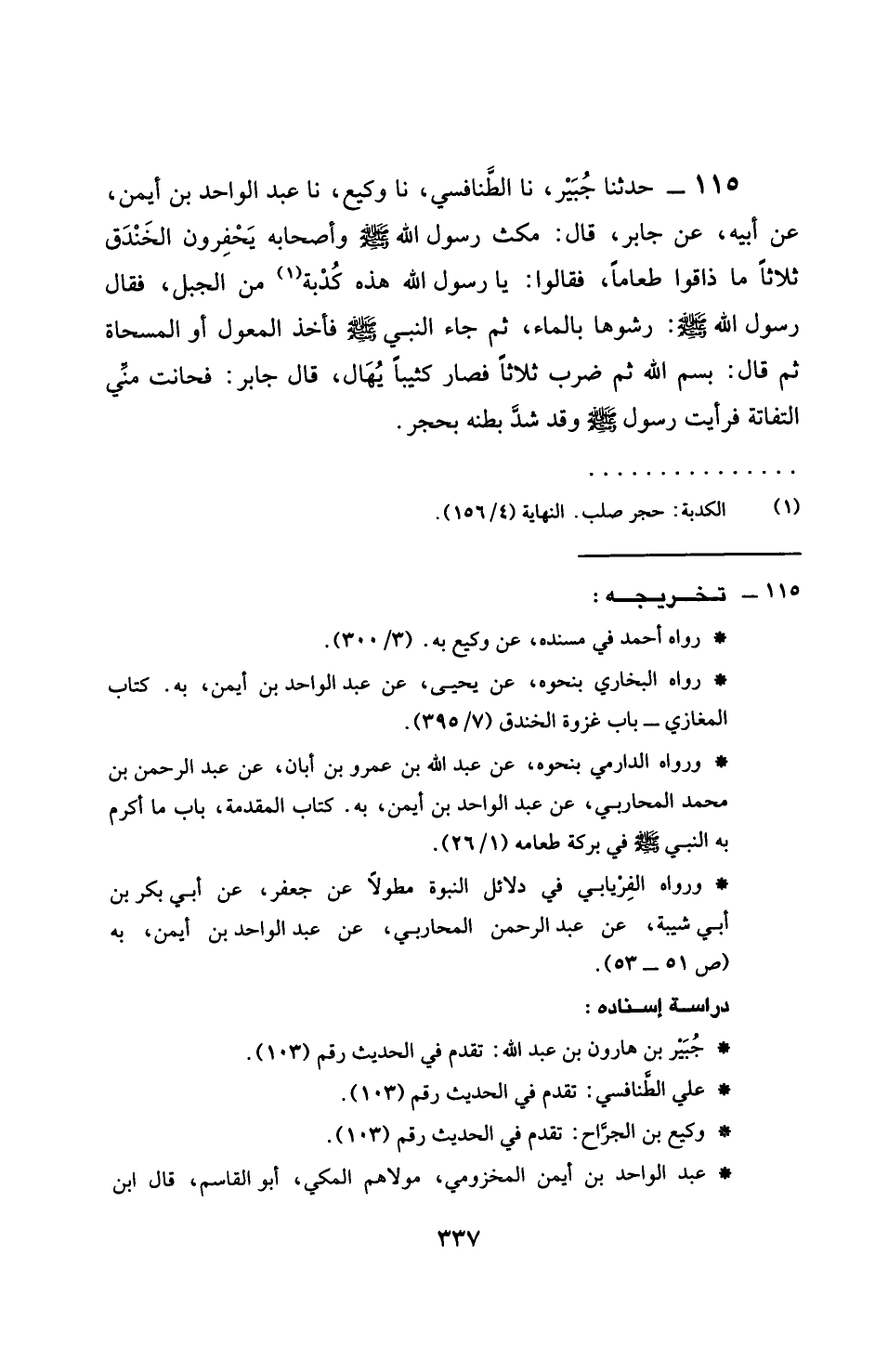 115 - حَدَّثَنَا جُبَيْرٌ، نَا الطَّنَافِسِيُّ، نَا وَكِيعٌ، نَا عَبْدُ الْوَاحِدِ بْنُ أَيْمَنَ، عَنْ أَبِيهِ، عَنْ جَابِرٍ، قَالَ: §" مَكَثَ رَسُولُ اللَّهِ صَلَّى اللهُ عَلَيْهِ وَسَلَّمَ وَأَصْحَابُهُ يَحْفِرُونَ الْخَنْدَقَ ثَلَاثًا مَا ذَاقُوا طَعَامًا، فَقَالُوا: يَا رَسُولَ اللَّهِ، إِنَّ هَذِهِ كُدْيَةً مِنَ الْجَبَلِ، فَقَالَ رَسُولُ اللَّهِ صَلَّى اللهُ عَلَيْهِ وَسَلَّمَ: رُشُّوهَا بِالْمَاءِ، فَرَشُّوهَا، ثُمَّ جَاءَ النَّبِيُّ صَلَّى اللهُ عَلَيْهِ وَسَلَّمَ، فَأَخَذَ الْمِعْوَلَ أَوِ الْمِسْحَاةَ، ثُمَّ قَالَ: بِسْمِ اللَّهِ، ثُمَّ ضَرَبَ ثَلَاثًا، فَصَارَ كَثِيبًا يُهَالُ، قَالَ جَابِرٌ: فَحَانَتْ مِنِي الْتِفَاتَةٌ فَرَأَيْتُ رَسُولَ اللَّهِ صَلَّى اللهُ عَلَيْهِ وَسَلَّمَ وَقَدْ شَدَّ بَطْنَهُ بِحَجَرٍ
