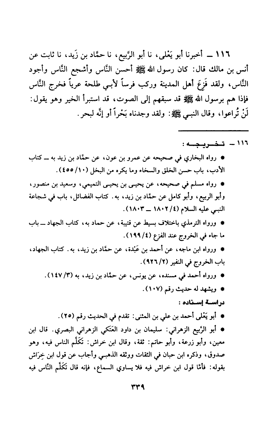 116 - أَخْبَرَنَا أَبُو يَعْلَى، نَا أَبُو الرَّبِيعِ، نَا حَمَّادُ بْنُ زَيْدٍ، نَا ثَابِتٌ، عَنْ أَنَسِ بْنِ مَالِكٍ، قَالَ: كَانَ رَسُولُ اللَّهِ صَلَّى اللهُ عَلَيْهِ وَسَلَّمَ §أَحْسَنَ النَّاسِ، وَأَشْجَعَ النَّاسِ، وَأَجْوَدَ النَّاسِ، وَلَقَدْ فَزِعَ أَهْلُ الْمَدِينَةِ، وَرَكِبَ فَرَسًا لِأَبِي طَلْحَةَ عُرْيًا، فَخَرَجَ النَّاسُ فَإِذَا هُمْ برَسُولُ اللَّهِ صَلَّى اللهُ عَلَيْهِ وَسَلَّمَ قَدْ سَبَقَهُمْ إِلَى الصَّوتِ قَدْ اسْتَبْرَأَ الْخَبَرَ وَهُوَ يَقُولُ: لَنْ تُرَاعُوا، وَقَالَ النَّبِيُّ صَلَّى اللهُ عَلَيْهِ وَسَلَّمَ: وَلَقَدْ وَجَدْنَاهُ بَحْرًا، أَوْ إِنَّهُ لَبَحْرٌ
