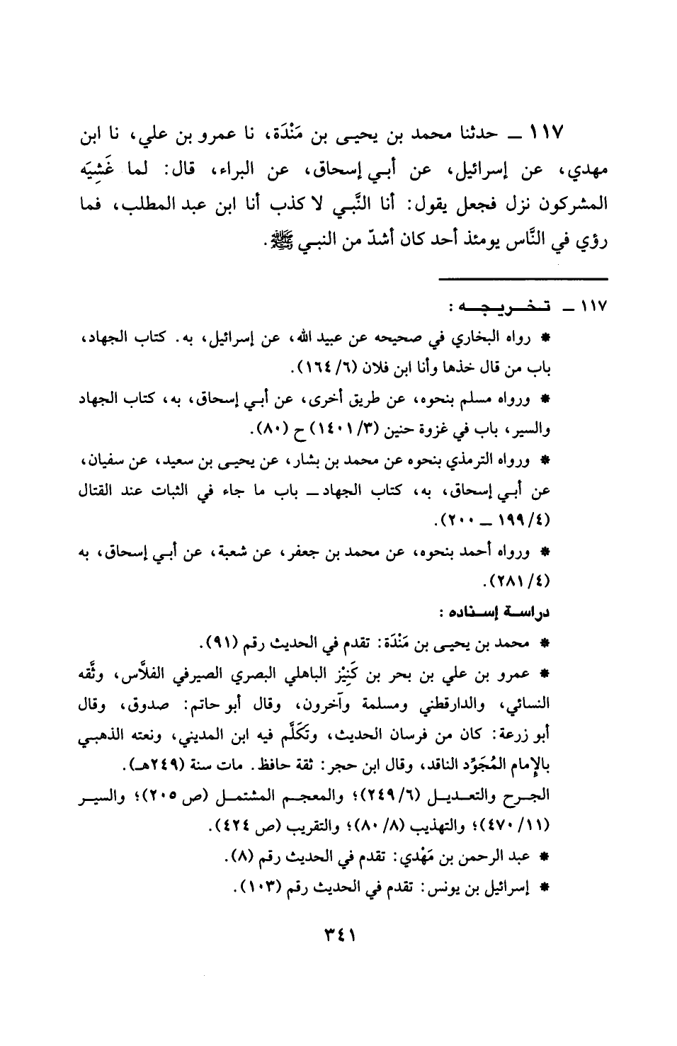 117 - حَدَّثَنَا مُحَمَّدُ بْنُ يَحْيَى بْنِ مَنْدَهْ، نَا عَمْرُو بْنُ عَلِيٍّ، نَا ابْنُ مَهْدِيٍّ، عَنْ إِسْرَائِيلَ، عَنْ أَبِي إِسْحَقَ، عَنِ الْبَرَاءِ، قَالَ: §لَمَّا غَشِيَهُ الْمُشْرِكُونِ، نَزَلَ فَجَعَلَ يَقُولُ: أَنَا النَّبِيُّ لَا كَذِبْ، أَنَا ابْنُ عَبْدِ الْمُطَّلِبِ. فَمَا رُؤِيَ فِي النَّاسِ يَوْمَئِذٍ أَحَدٌ أَشَدَّ مِنَ النَّبِيِّ صَلَّى اللهُ عَلَيْهِ وَسَلَّمَ