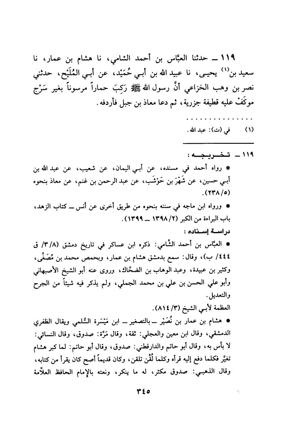 119 - حَدَّثَنَا الْعَبَّاسُ بْنُ أَحْمَدَ الشَّامِيُّ، نَا هِشَامُ بْنُ عَمَّارٍ، نَا سَعِيدُ بْنُ يَحْيَى، نَا عُبَيْدُ اللَّهِ بْنُ أَبِي حْميَدَ، عَنْ أَبِي الْمَلِيحِ، حَدَّثَنِي نَصْرُ بْنُ وَهْبٍ الْخُزَاعِيُّ، §أَنَّ رَسُولُ اللَّهِ صَلَّى اللهُ عَلَيْهِ وَسَلَّمَ رَكِبَ حِمَارًا مَرْسُونًا بِغَيْرِ سَرْجٍ مُوكَفٌ عَلَيْهِ قَطِيفَةٌ جَزَرِيَّةٌ، ثُمَّ دَعَا مُعَاذَ بْنَ جَبَلٍ فَأَرْدَفَهُ