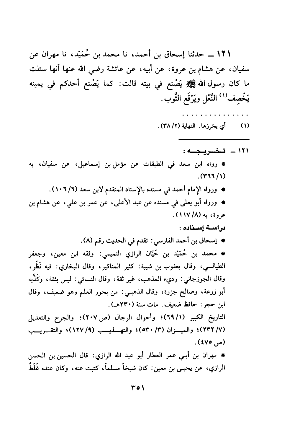 121 - حَدَّثَنَا إِسْحَاقُ بْنُ أَحْمَدَ، نَا مُحَمَّدُ بْنُ حُمَيْدٍ، نَا مِهْرَانُ، عَنْ سُفْيَانَ، عَنْ هِشَامِ بْنِ عُرْوَةَ، عَنْ أَبِيهِ، عَنْ عَائِشَةَ، رَضِيَ اللَّهُ عَنْهَا أَنَّهَا سُئِلَتْ: §" مَا كَانَ رَسُولُ اللَّهِ صَلَّى اللهُ عَلَيْهِ وَسَلَّمَ يَصْنَعُ فِي بَيْتِهِ؟ قَالَتْ: كَمَا يَصْنَعُ أَحَدُكُمْ فِي بَيْتِهِ يَخْصِفُ النَّعْلَ، وَيَرْقَعُ الثَّوْبَ "