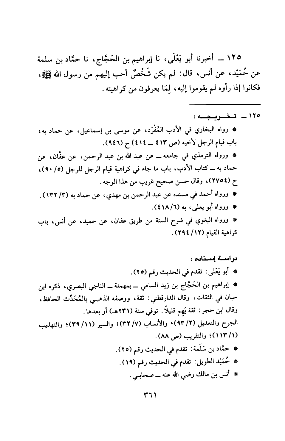 125 - أَخْبَرَنَا أَبُو يَعْلَى، نَا إِبْرَاهِيمُ بْنُ الْحَجَّاجِ، نَا حَمَّادُ بْنُ سَلَمَةَ، عَنْ حُمَيْدٍ، عَنْ أَنَسٍ، قَالَ: §لَمْ يَكُنْ شَخَصٌ أَحَبَّ إِلَيْهِمْ مِنْ رَسُولِ اللَّهِ صَلَّى اللهُ عَلَيْهِ وَسَلَّمَ، فَكَانُوا إِذَا رَأَوْهُ لَمْ يَقُومُوا إِلَيْهِ، لِمَا يَعْرِفُونَ مِنْ كَرَاهِيَتِهِ لَهُ.